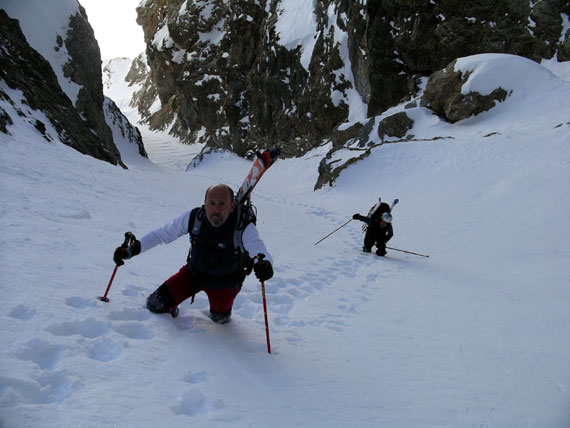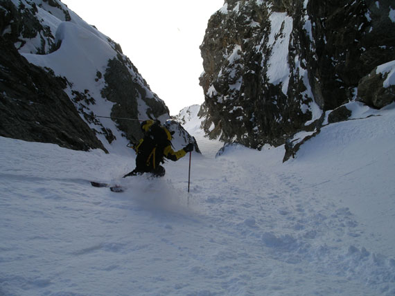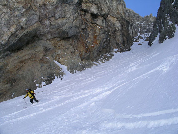 Long vallon d?approche (6 km), puis on découvre le couloir au dernier moment, on ne sait pas si il sort vu du bas, car du fait qu?il soit tournant, on ne voit pas la sortie. La bonne neige et les bouquetins au sommet nous font vite oublier l?approche, qui se ski finalement bien en descendant. Sauvage et sympatique couloir. Mont Rosset, Roc de la Charbonnière et tour de la Pierra Menta tracé.
