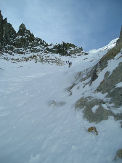 La veille, j'avais zyeuté le couloir N qui me semblait en très bonnes conditions. Petite tranchée à faire dans la corniche puis on a posé une main courante sur 8 m pour entrer dans le couloir. Merci au randonneur nous ayant balancé la corde ensuite.