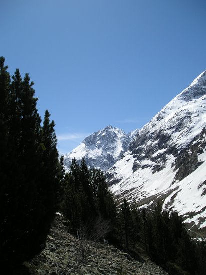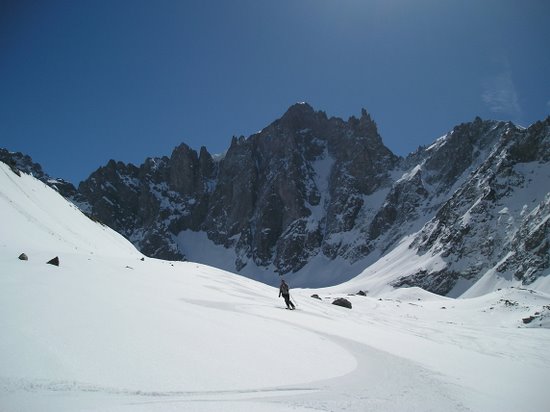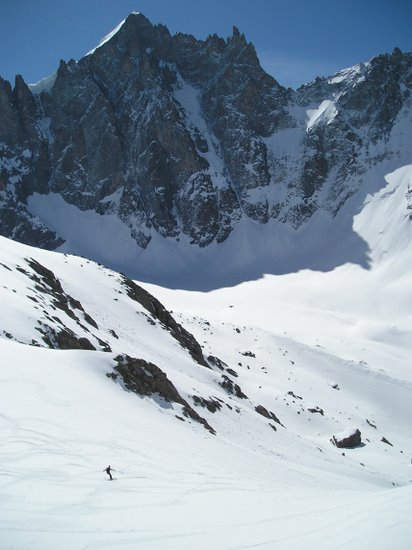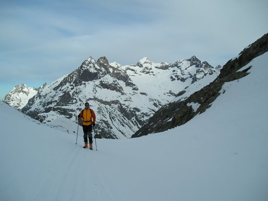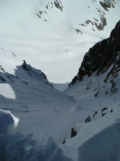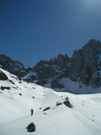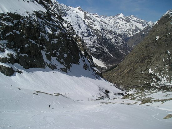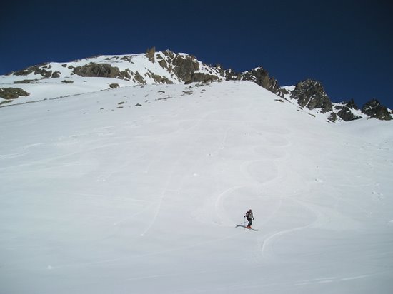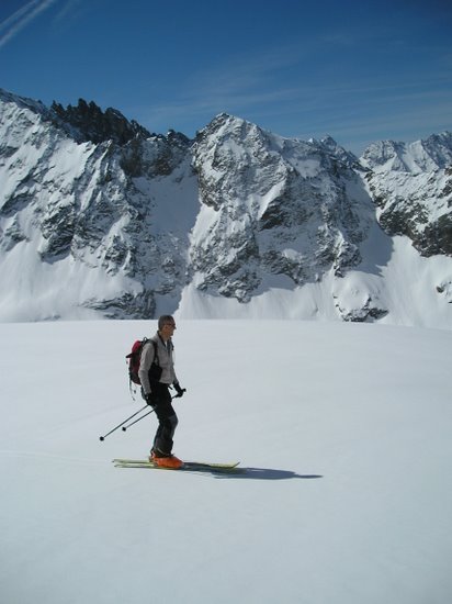 Je mitraillais, entre autres, la Cime de l'Encoula en me disant que ça devait passer.. Sur le sentier du retour, Bertrand me fait remarquer des traces "en face".. Gasp, je sors le monocle et voit 4 skieurs sur le glacier de l'Encoula puis en remontant tout leur itinéraire depuis la crête.. ça c'est fait.