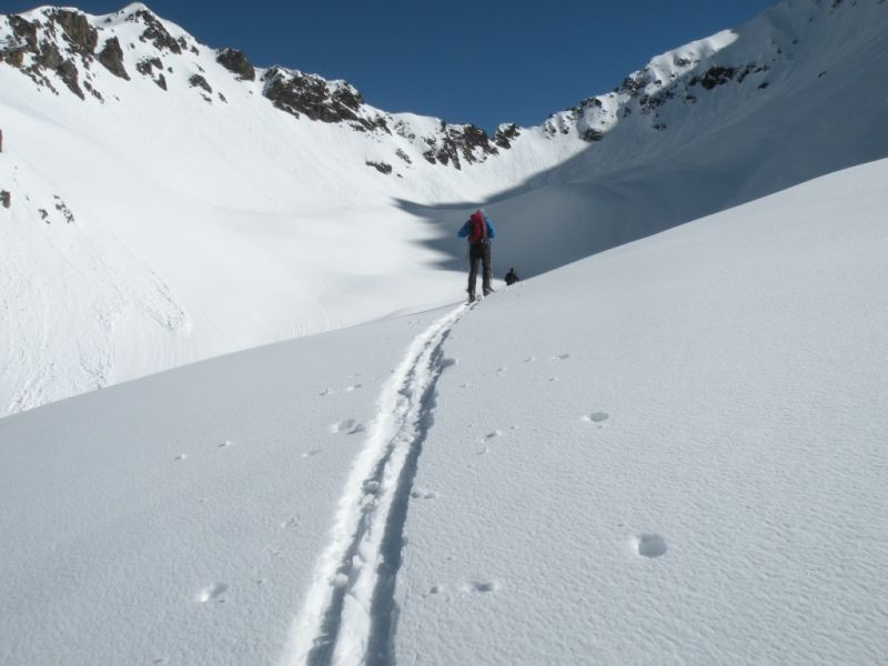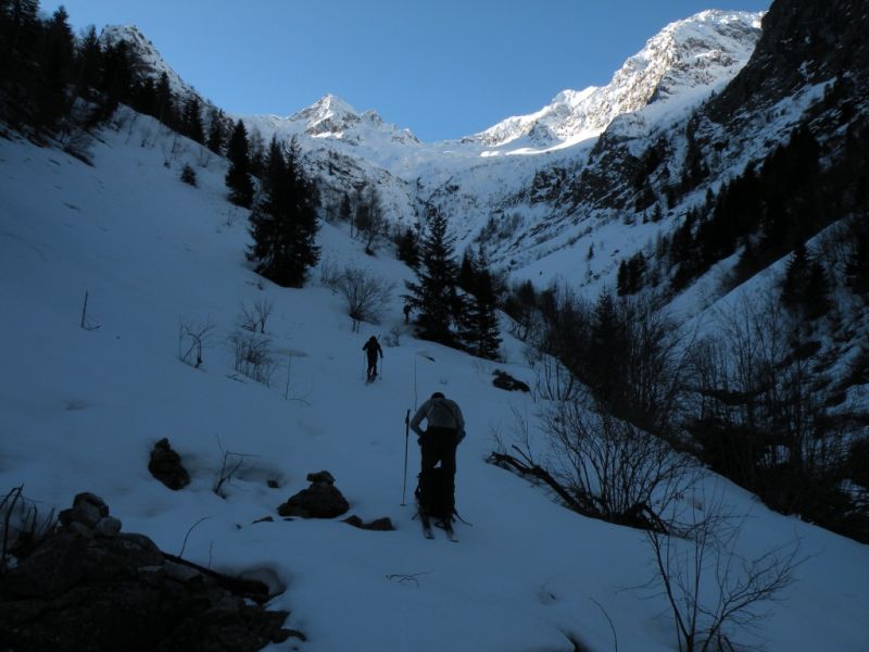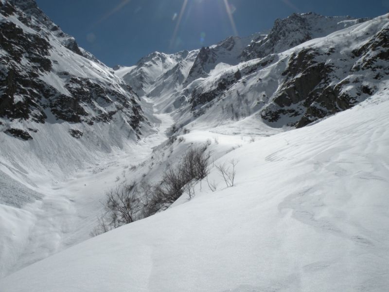 Le Valjouffrey, vraiment un coin perdu où il y a plein de courses possibles. Cette année l'enneigement est vraiment bon. On a porté dans la forêt mais ça fait à peine 200m de déniv et le sentier est raide du coup on dénivelle vite. Ensuite le vallon est superbe, on est seul au monde. La montée est soutenue dans le ruisseau de Suchière. On se demande si on fait la traversée ou si on fait un autre col dans le coin, on a peur d'être un peu tard et de choper de la neige trop molle en versant Nord Est car le soleil est haut à cette période. Finalement on opte pour la traversée et c'est le bon choix. presque 500m de poudreuse bien froide sur le haut. Ensuite on a le droit a un peu de croute puis neige de printemps. On arrive au Désert ski au pied mais ça ne devrait pas durer. Même du coté de Cote Belle il y a très peu de portage, l'enneigement est vraiment bon. Les conditions ne sont pas encore printanière mais si le temps le veut bien on peut avoir de bonnes conditions cette année dans ce secteur.