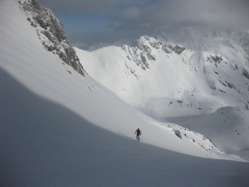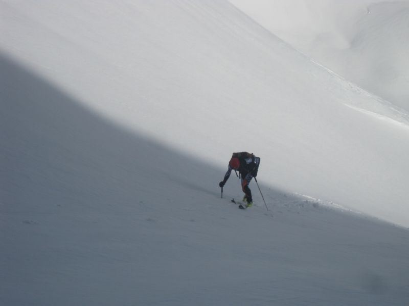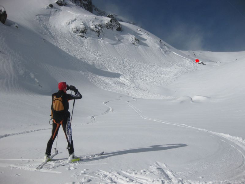 Michel a déclenché une plaque alors qu'il enclenchait un virage sur une pente débonnaire. La cassure s'est propagée en amont sur une hauteur d'une trentaine de mètres de déniv et une quarantaine de mètre de distance. La coulée (lente) a complétement recouvert nos traces. Ça illustre parfaitement que l'on puisse déclencher une plaque alors qu'on se trouve dans une pente à 20°.