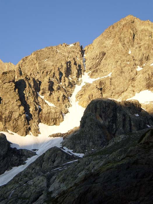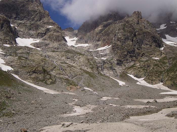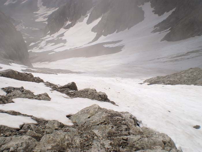 On ne risque pas grand-chose, si on respecte les horaires, car la neige récente (qui était sans doute plutôt de la grêle mêlée à de la pluie selon les jours et les altitudes) s'est quand même un peu tassée. Par contre, comme je n'ai pas remonté la partie finale plus raide, je ne sais pas ce qu'il en est au-dessus de 3100. Le risque vient plutôt des cailloux, dont les salves se déclenchent toutes les trois minutes... mais ils viennent plutôt des Aupillous. Méfiance donc dans la partie médiane du glacier-névé. Autre danger, limité, quelques crevasses ou fissures peu profondes, mais que l'on voit mal à la descente, surtout qu'on a un peu les yeux dans le dos...