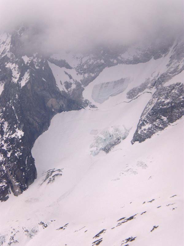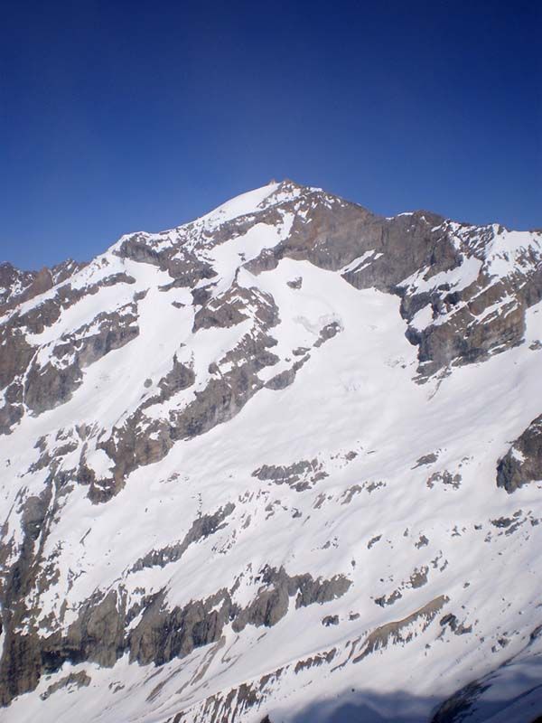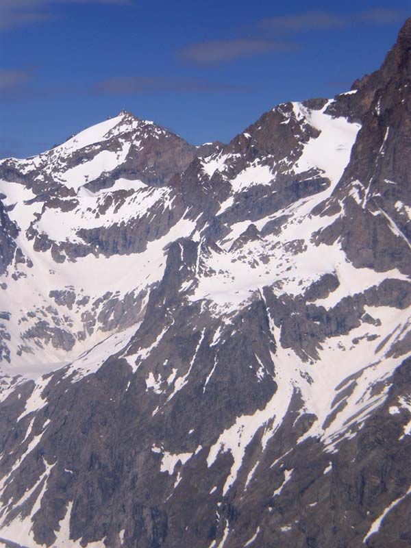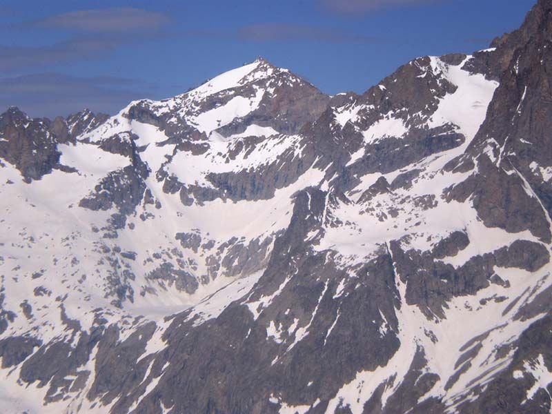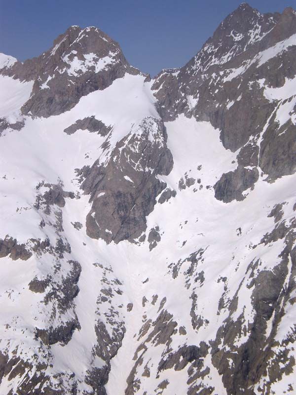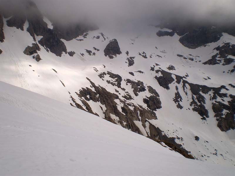 Partis pour le col du Pavé, nous avons fait l'erreur de trop monter (presque 3000) et nous avons raté la traversée pour le refuge du Pavé. Du coup, comme nous ne voulions pas faire la traversée expo sous la pointe Castelnau, ni redescendre au refuge, nous nous nous sommes rabattus sur la jolie brèche des Chamois. Il n'y a pas 36 passages pour franchir les petites barres. Le petit couloir d'accès direct au refuge (en pointillés sur la photo, plus visible sur ENO) est très étroit. Le mieux pour le col du Pavé est de passer par l'est du lac et de remonter comme indiqué sur IGN. La traversée (indiquée en gras sur ENO) est à proscrire à mon avis.