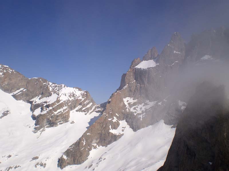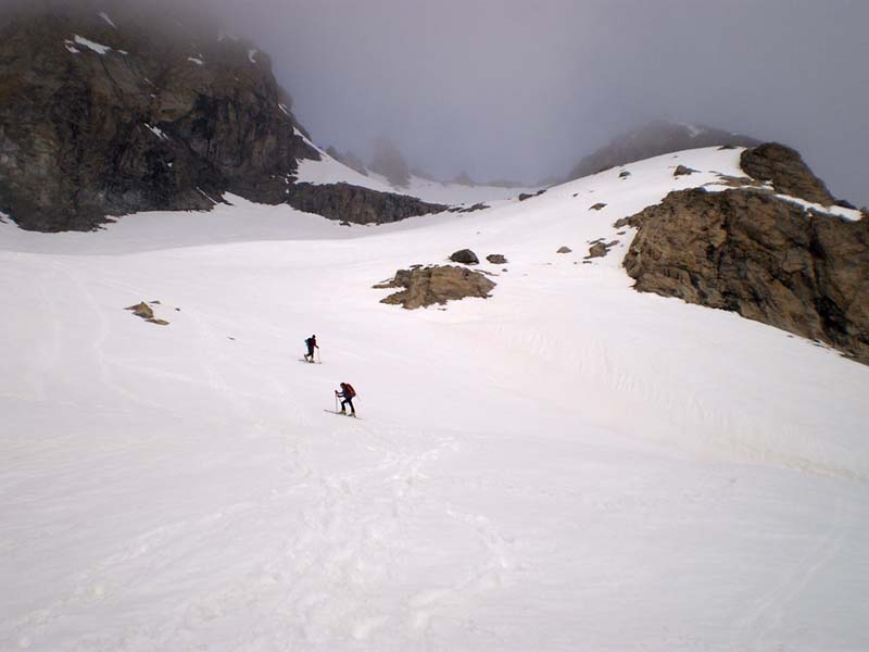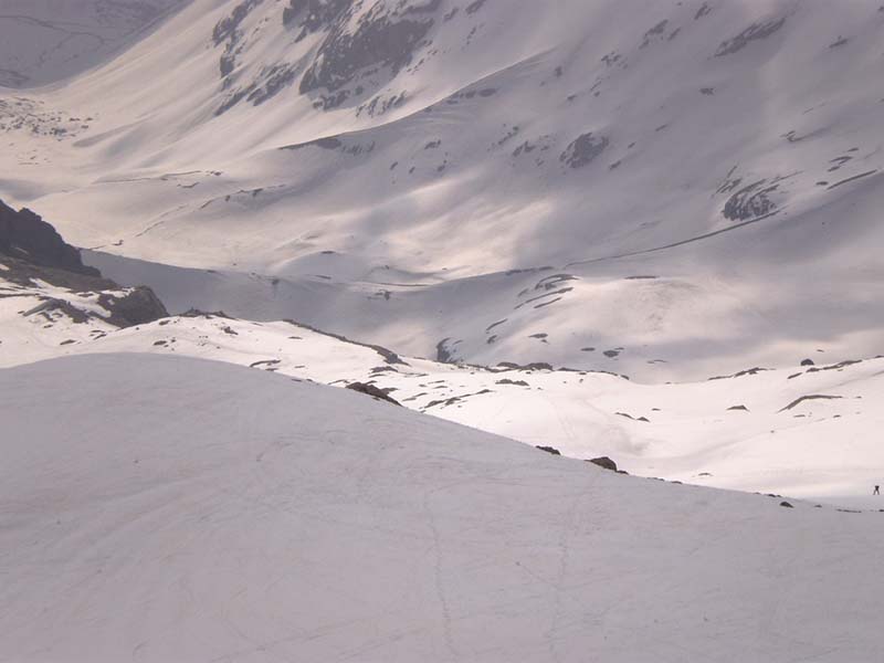 Arrivés à la brèche à 9h45, nous avons attendu 10h30 pour descendre. La neige était encore dure sur 100 m puis excellente sur 700 m. Encore bien skiable, avec quelques zones de neige très molle, jusqu'à Valfourche. Ensuite, on conserve la neige en rive droite sans trop de problèmes. La météo nous a joué des tours, puisqu'il nous était annoncé une belle matinée puis des nuages à mi-journée, et cela fut exactement l'inverse. Cela dit, c'était grand beau dans les Étançons ! Rencontre sympathique à la brèche d'un skieur venu de Grenoble, qui s'est levé à la même heure que nous au refuge !