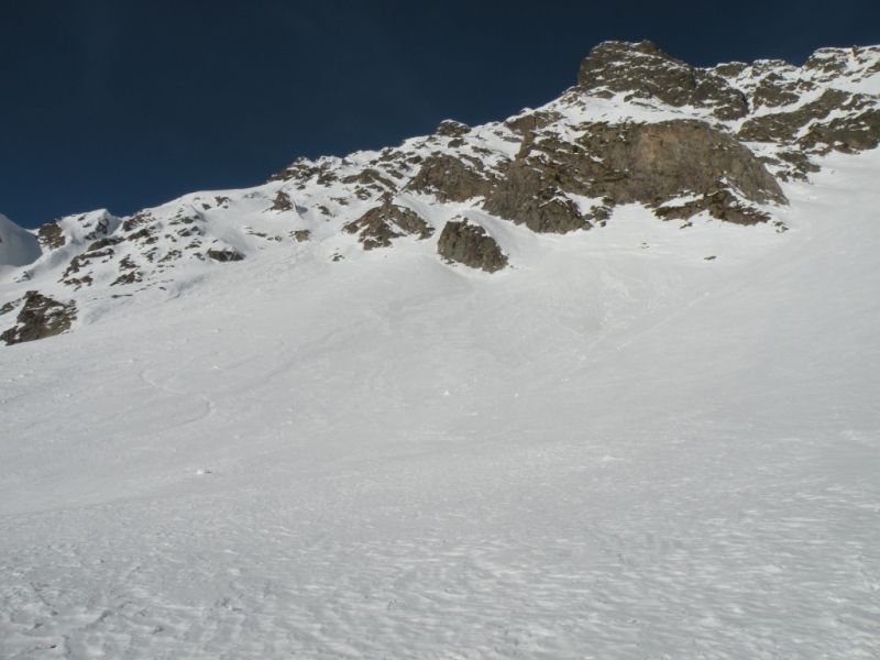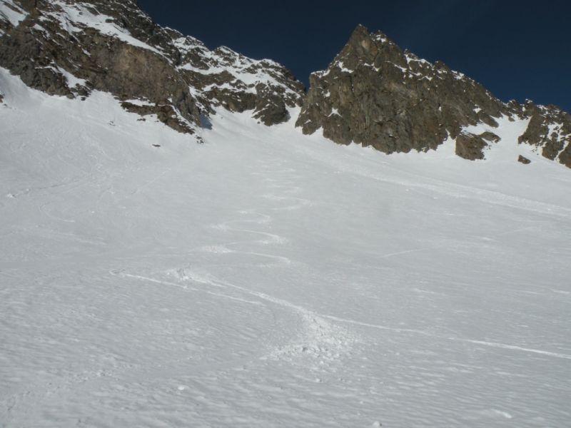 La neige n'a pas totalement transformée. Des coulées sont parties, c'est plutôt bien purgée, mais il reste quelques zones de reptations qui ne demande qu'à partir avec la chaleur.