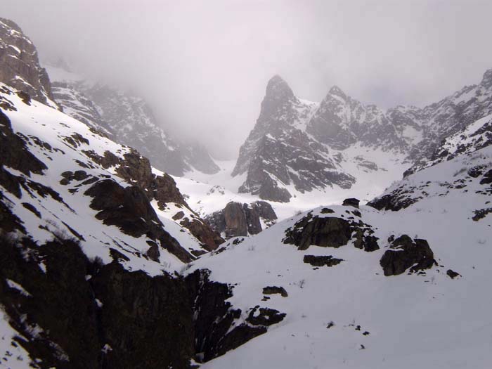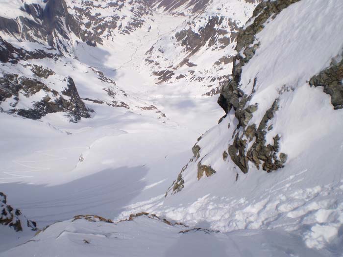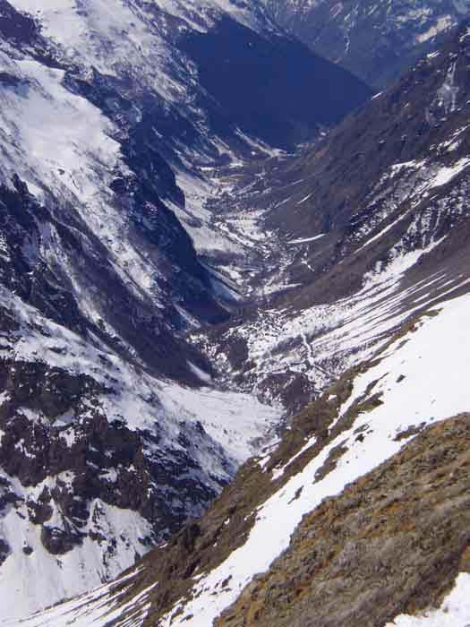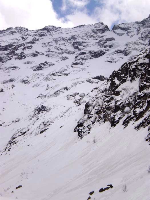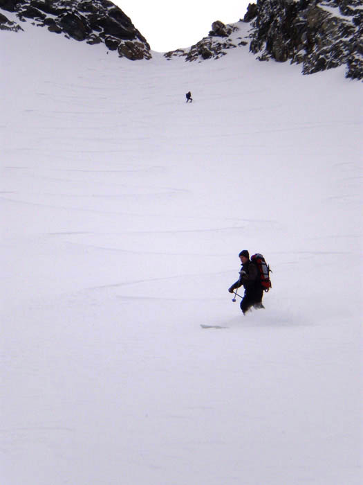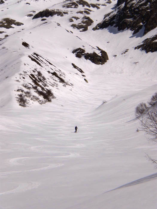 La fin est assez stable, car la neige est homogène et très légèrement humidifiée. Dessous, on trouve une couche fragile d'assez ferme à sans consistance. Nous avons un peu plus hésité dans la montée de la rampe entre 2750 et 2900, exposée au-dessus de la chute glaciaire et orientée nord-est, plus froide. On y trouve une poudreuse sèche avec une couche fragile 30 cm en-dessous. Pour le reste, pas un glaçon n'a bougé. Plus bas, sur les rives de la Séveraisse, de nombreuses coulées, dont certaines sans doute très récentes, ont déjà bien purgé le secteur. Se méfier des nombreux trous qui apparaissent dans la profonde neige pourrie au retour, surtout pour nos amis surfeurs...