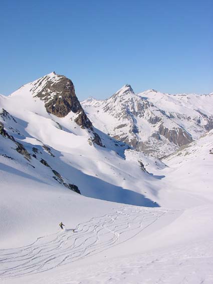Très bon enneigement dans l'ensemble, y compris sur les faces sud en face ; on skie presque partout à la route