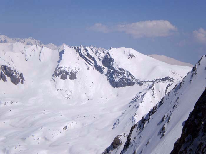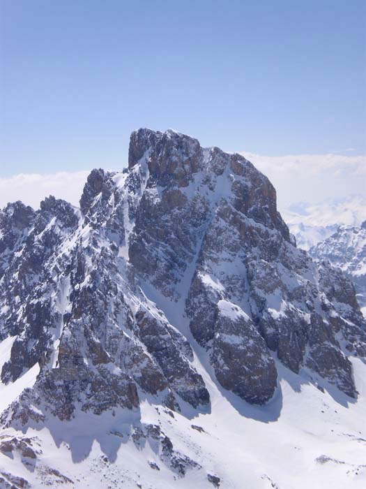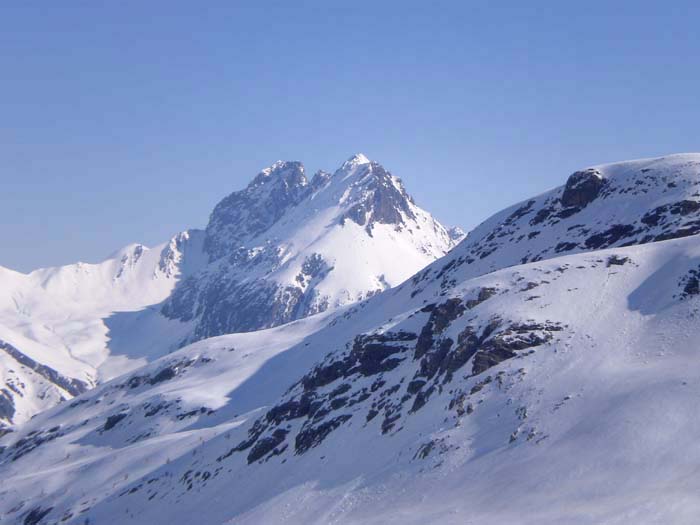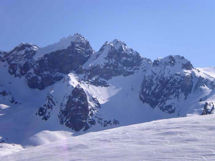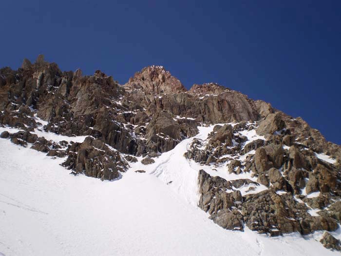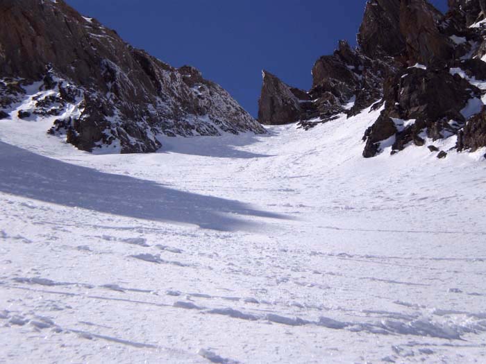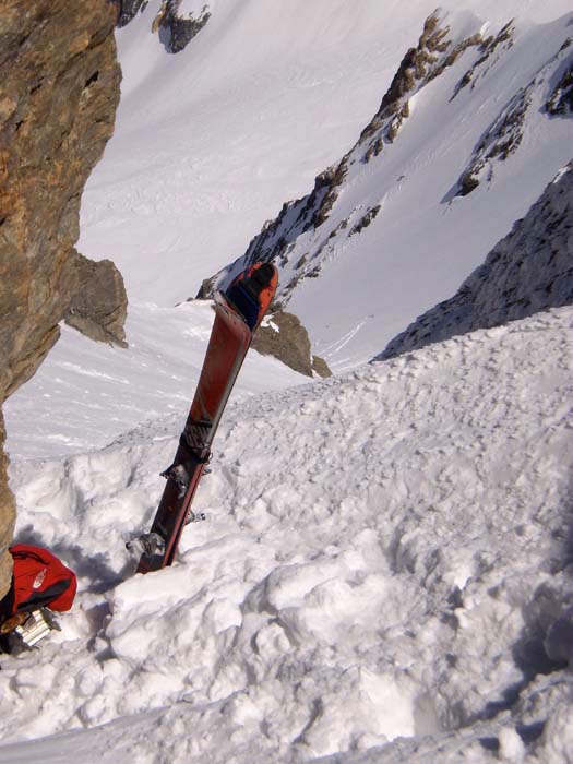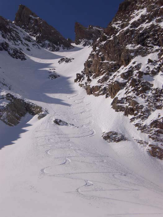 Sortie splendide, où la qualité de la neige m'a permis de finir ce couloir que je n'avais pu terminer le 9 mai 2004. Merci à mes 2 prédécesseurs de la veille, sans doute, qui ont laissé une bonne trace (à pied sans crampons entre 2970 et 3000, puis >3170). Les trois derniers mètres se font obligatoirement à pied, puisqu'on passe dans une petite étroiture entre les rochers. Par contre, on dispose d'une belle banquette pour chausser juste en dessous d'une belle pointe triangulaire. Descente en escaliers sur quelques mètres en raison d'une neige dure irrégulière et de quelques cailloux. Après, c'est du grand ski sur tout le couloir. Il n'y a que les plaques de surface qui, en explosant, empêchent de voir ce qu'on fait... Jusque vers 2600, on tourne encore agréablement et puis on passe sans transition à la soupe, avec encore de jolis passages en moquette molle.