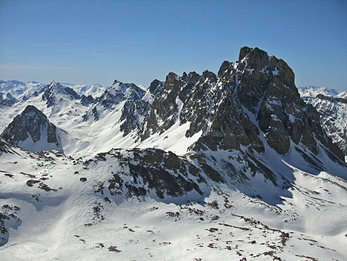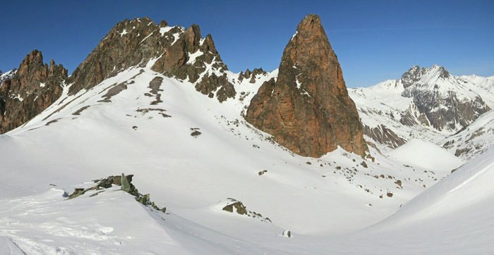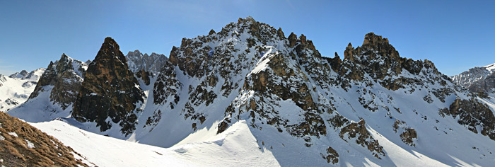 D8 puis remontée au col de l'Aiguille Large pour passer sous l'aiguille Pierre André avant de rejoindre en traversée le col puis le sommet sud de Miéjour. Fin sur Maljasset par la banquette perchée à droite (orographiquement parlant) de la Teste.