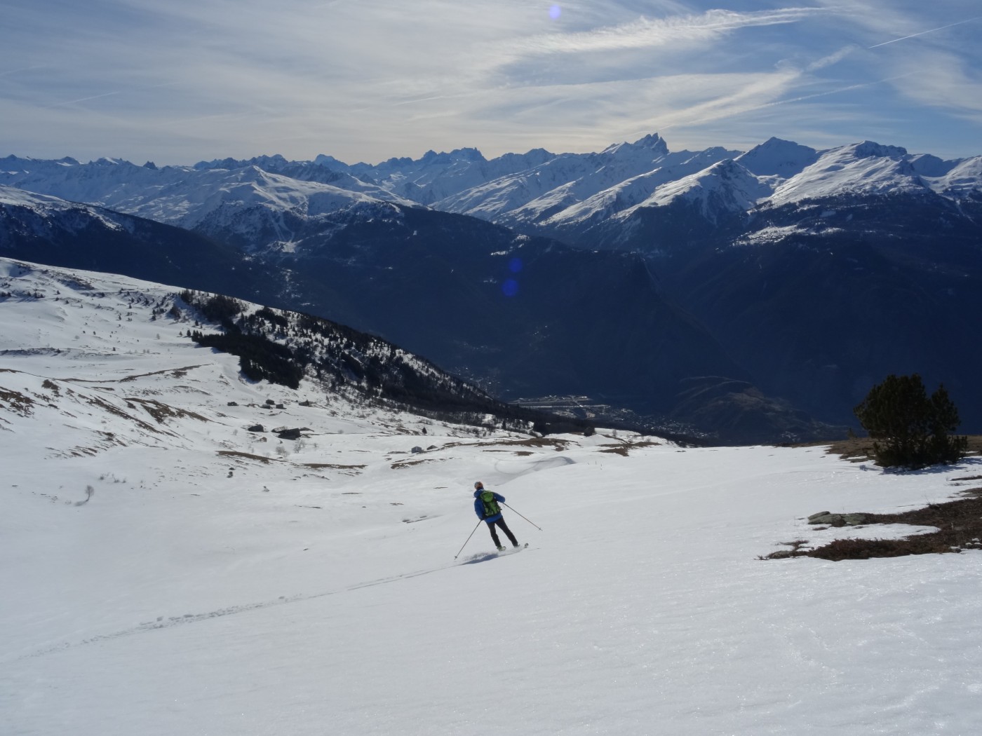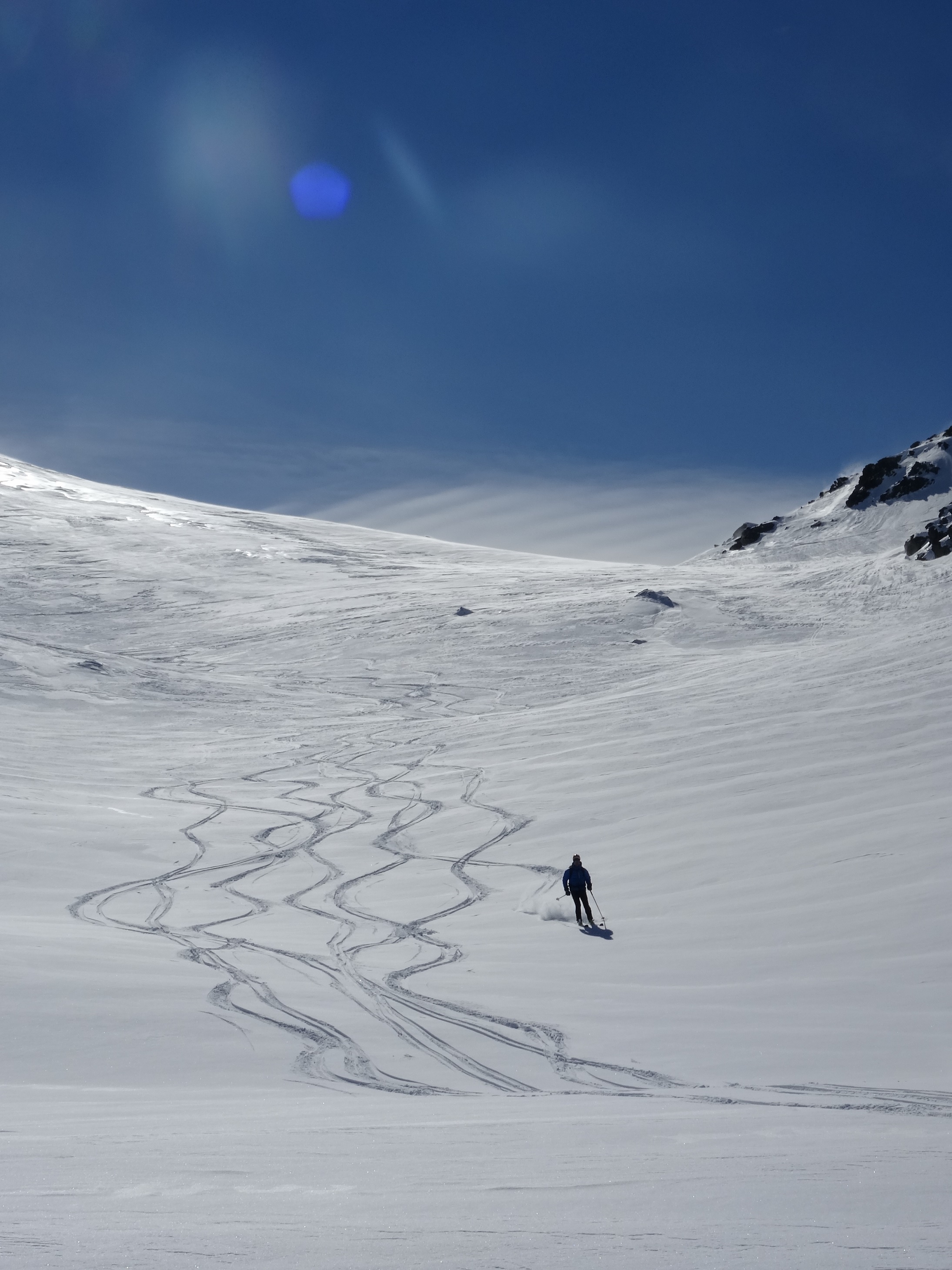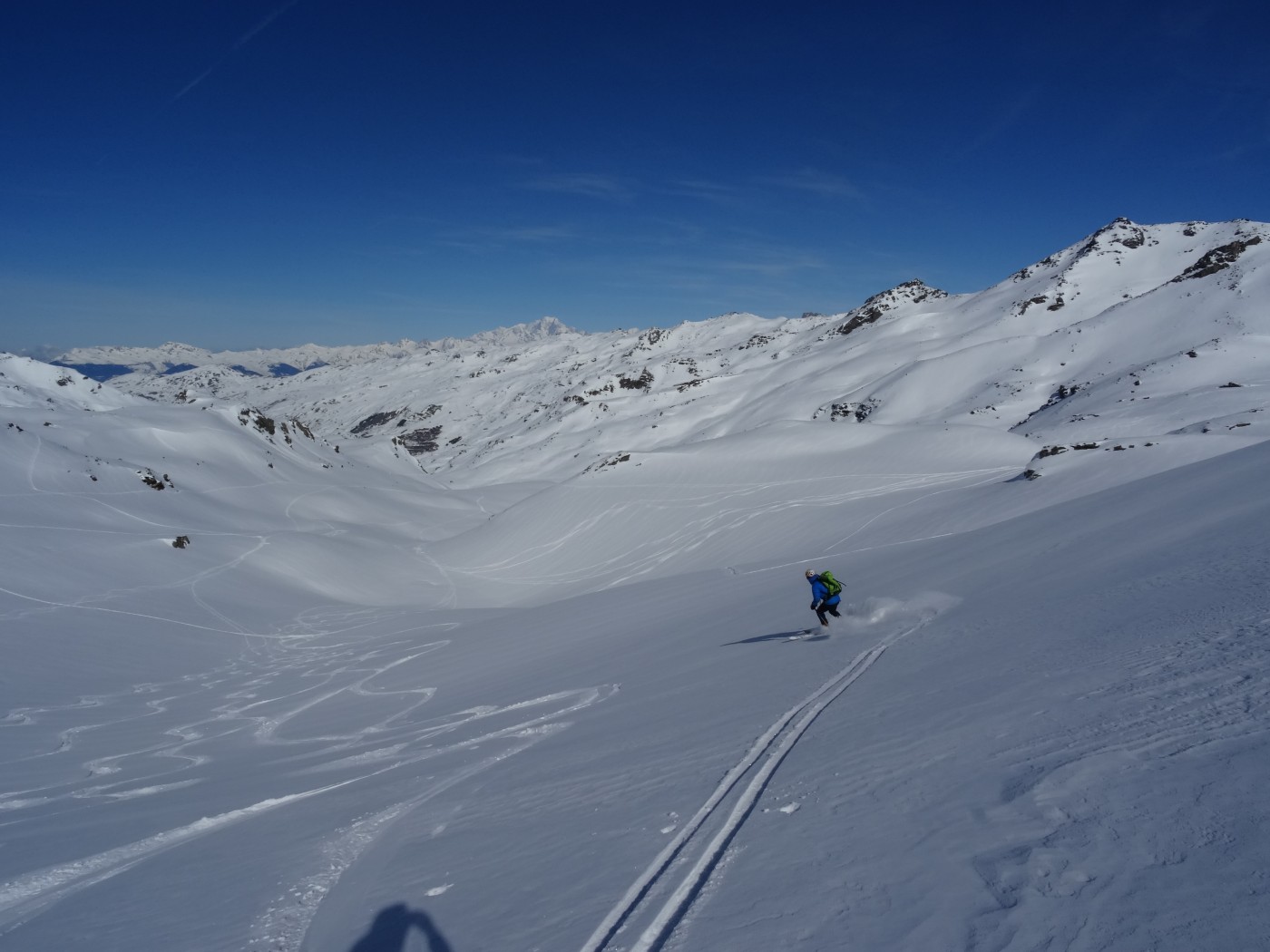 Finalement du ski correct voire bon sur ce versant ingrat du Bréquin, balayé ce jour par des rafales de nord à nord-est insistantes. En nord dès que l'on s'éloigne des crêtes la neige était encore poudreuse avec peu de traces récentes malgré la proximité des Ménuires (et de la cime Caron).