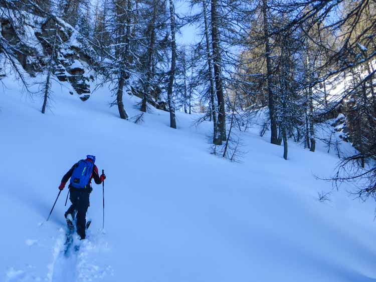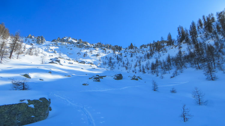 Garino >> Buchet (crête au nord de la Piovosa) par le Chiot della Pissa >> 2 descentes dans les mélèzes >> remontée vers la Piovosa >> arrêt à 2350 m >> descente par le combale della Pena >> Tolosana >>Garino