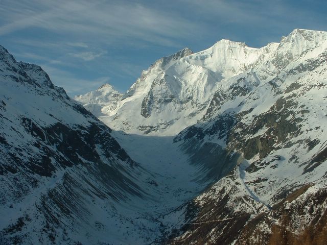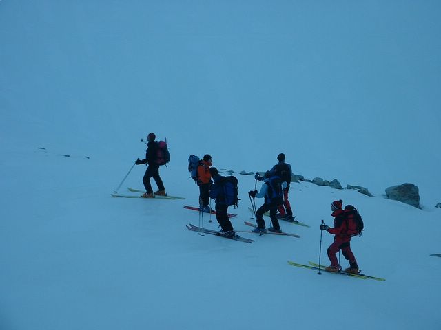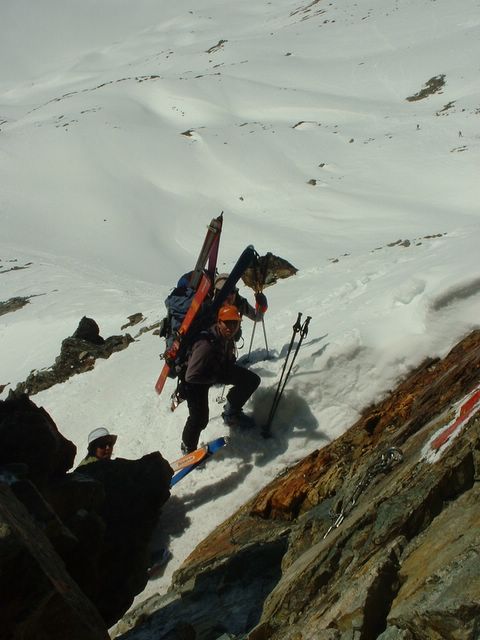 Possibilité de faire la traversée par l'arete du Blanc et son passage hyper aérien et expo et d'enchainer par le glacier du Moming tres tortueux et crevassé etc ... pas pour nous !! On préfere la descente par "le pied" du Mammouth et retour sur le glacier de Zinal. Traversée le pont sur le replat vers 1900 m et direction Roc de la Vache et ensuite l'immense vallon du Tracuit.