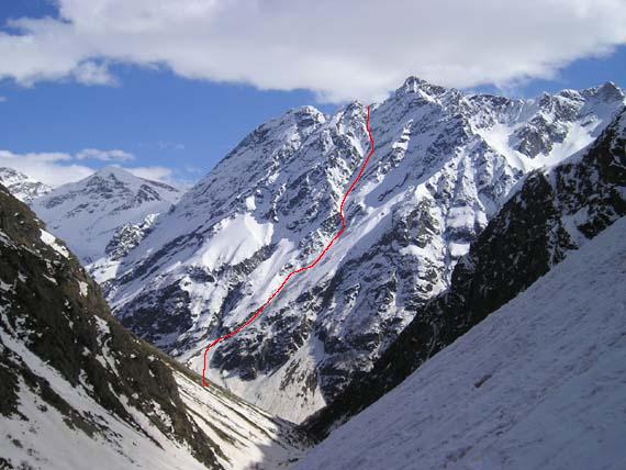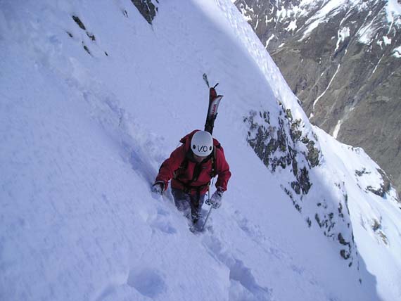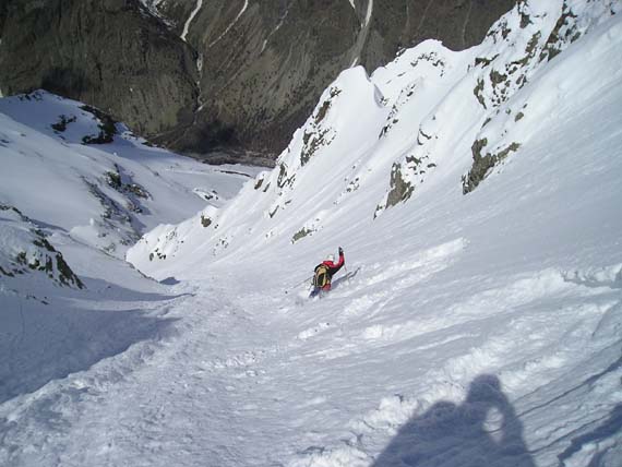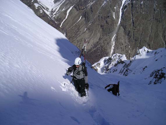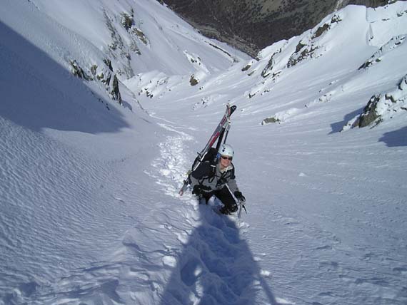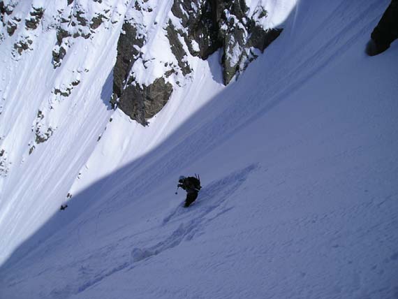 Superbe couloir repéré la semaine dernière du ravin d'isola (un des seuls endroits où on le voit en intégralité). Très long (1000m) assez large et bordé de hautes falaise l'ambiance est extra d'autant plus qu'on avait l'impression d'être parmi les premiers à y venir: il a du toutefois recevoir la visite de quelques locaux mais doit être rarement parcouru: il faut dire que quand on voit le résultat de l'avalanche au fond de la vallée il faut bien choisir son moment pour y venir! La pente fut moins raide que ce qu'on pensait (jamais >45°) mais la descente fut extraordinaire dans une super poudre. A conseiller mais gare aux contre pentes qui purgent rive gauche le matin et rive droite l'après midi.