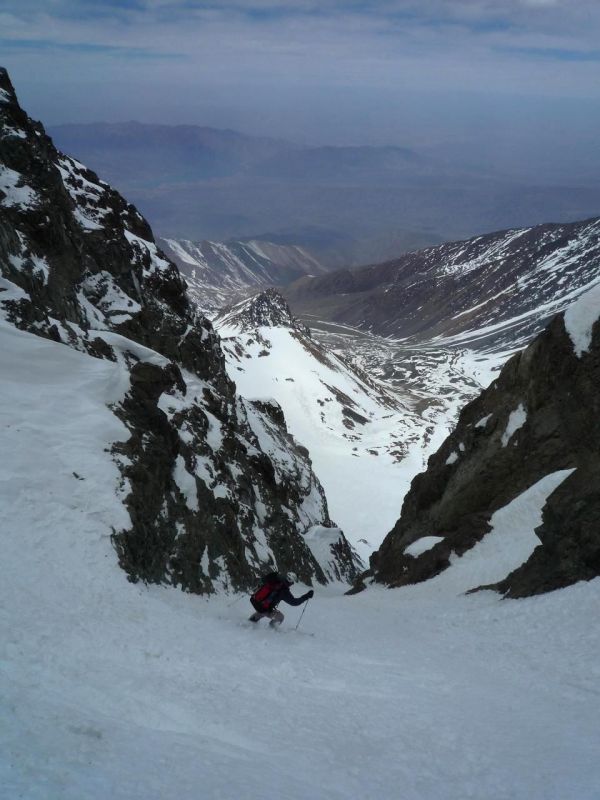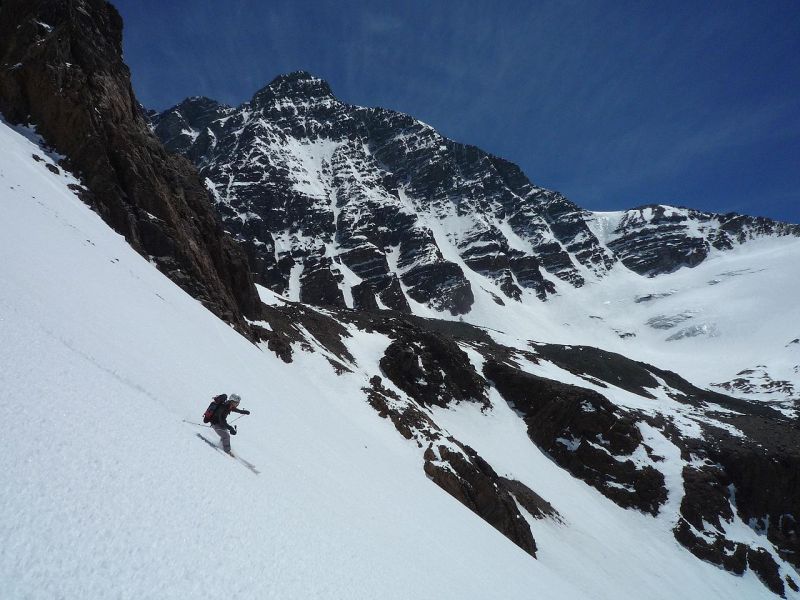 Difficile de ne pas remarquer l'évident couloir qui entaille la face est du Rincón, même si la sortie n'a pas l'air évidente. Nous nous attaquerons donc au "supercanalera" un jour d'acclimatation plus tard, passé sur le versant nord du Lomas Amarillas (arrêt vers 4750m). La montée sera efficace au début, plus fastidieuse par la suite à cause des effets de l'altitude. Puis nous pourrons enfin valider nos hypothèses de sorties : ça passe. Descente concentrée, car la neige regèle en partie, et la fatigue commence à peser. Nous redescendrons directement au cosmopolite refuge San Bernardo, où nous attendent confort et chaleur.