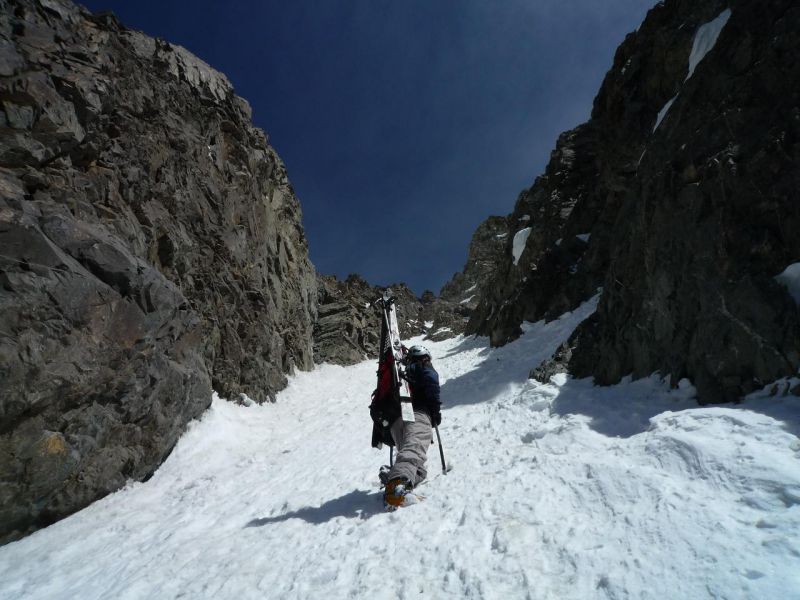 Ce couloir a été ouvert en alpi en 1968. Un guide de Mendoza (à 80km) nous affirmera au refuge n'avoir jamais entendu parler de skieurs dans cette voie.
