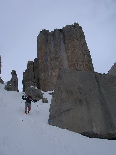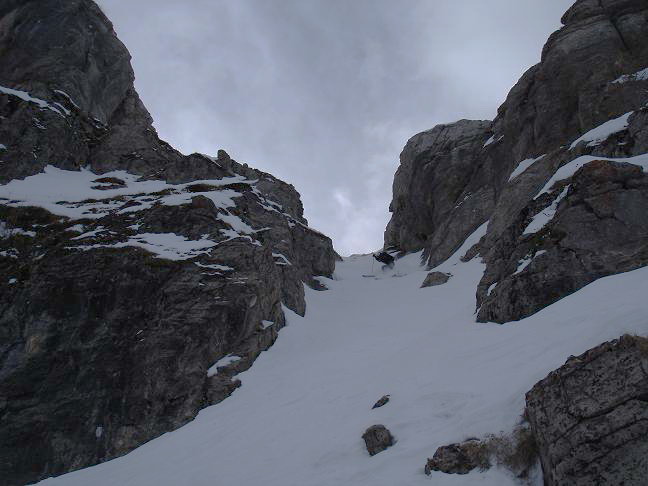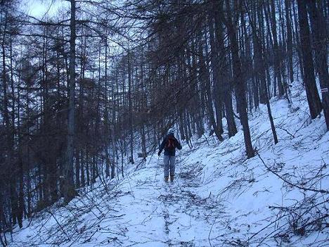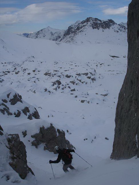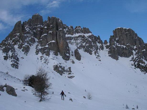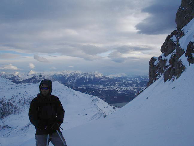 Sitôt dépassé la station de Réallon, un isolement total en ce jour de grand froid (les glaçons se formaient dans la gourde). Comme dit Louis Volle dans le toponeige, Chabrières n'est pas une "montagne bonzaï". Nous avons accédé au couloir de l'Oucane par un petit couloir étroit, une traversée supérieure se révélant trop étroite et exposée.
