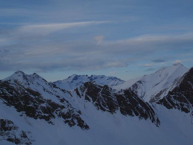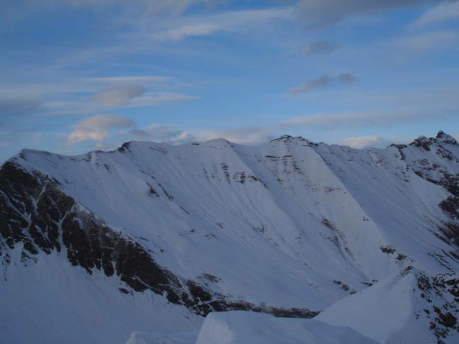 Transport de neige d'est en ouest avec le vent violent, chasse-neige sur les crêtes.