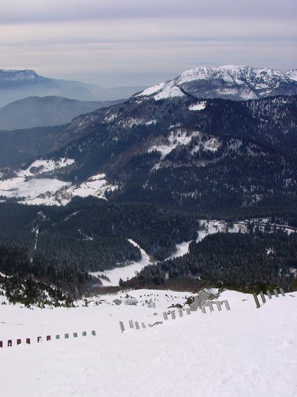 ai emprunté en haut le couloir au pied du câble car il n'y avait qu'une trace alors qu'ailleurs c'était déjà bien traffolé. A noter (sans conséquence ici) : la neige récente assez lourde glisse sur le fond dur >35-40° dans la forêt ai croisé le gardien de chamechaude, Oliv. , qui en redescendait. Pas mal de monde, presque autant de raquettes que de skis.