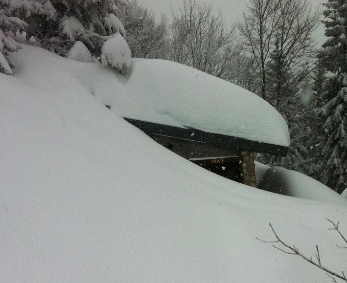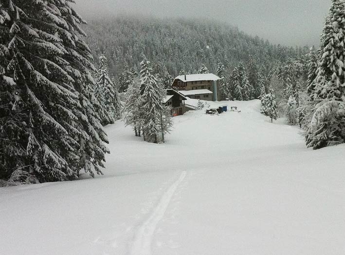 mis en appétit par une route blanche et déserte, je n'ose me garer au tk (parking non déneigé) de peur de gêner la dameuse et puis pas vu de trace. départ du col : aie pas de trace non plus ici. Me faire ça à moi, à mon âge, en plein jour à Chamechaude : pas vécu ça depuis longtemps. Ouf, à 1550 je trouve une trace un peu couverte. Celle du service public (branche EN). David (Zijp) et Laurent, qui étaient montés sous le tk ; ils me rattrapent avant le haut lors de leur 2eme montée.
