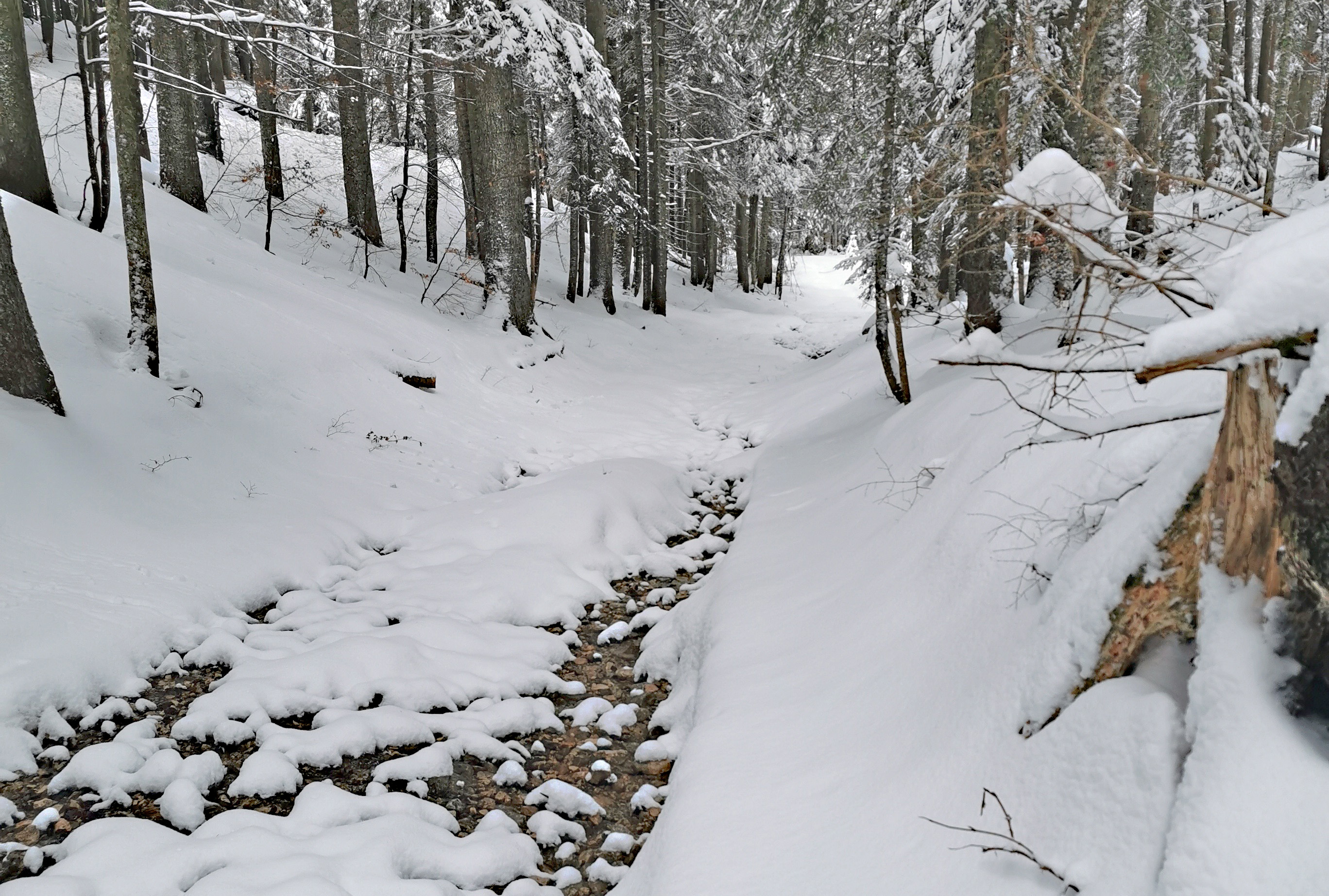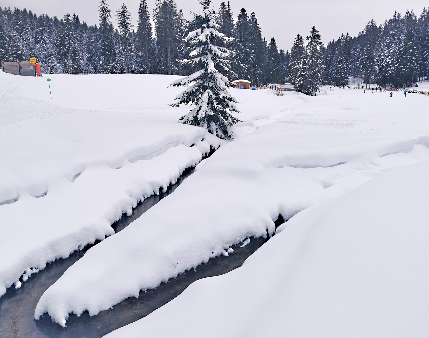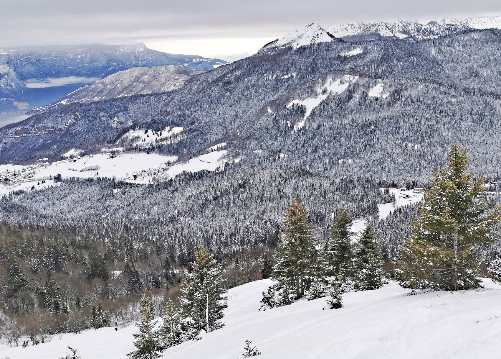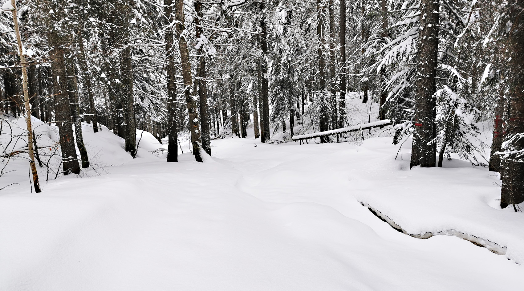 Bonne surprise pour la forêt skiable sur 400 m entre 1650 et 1250 (biathlon). La suite sur St Hugues pour voir. Avec de nouvelles chutes et sans damage ne passera pas sans pousser sur les bâtons.