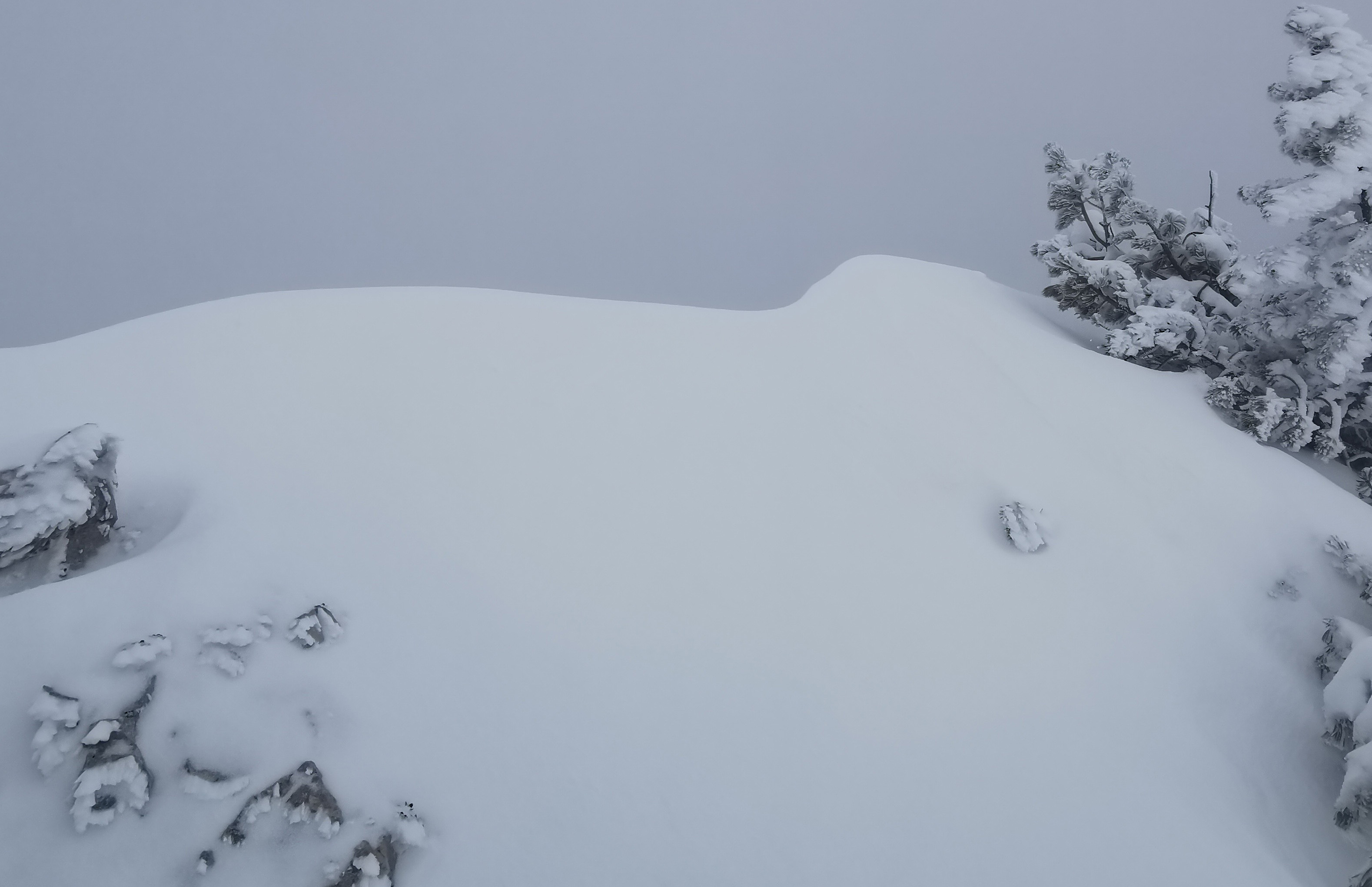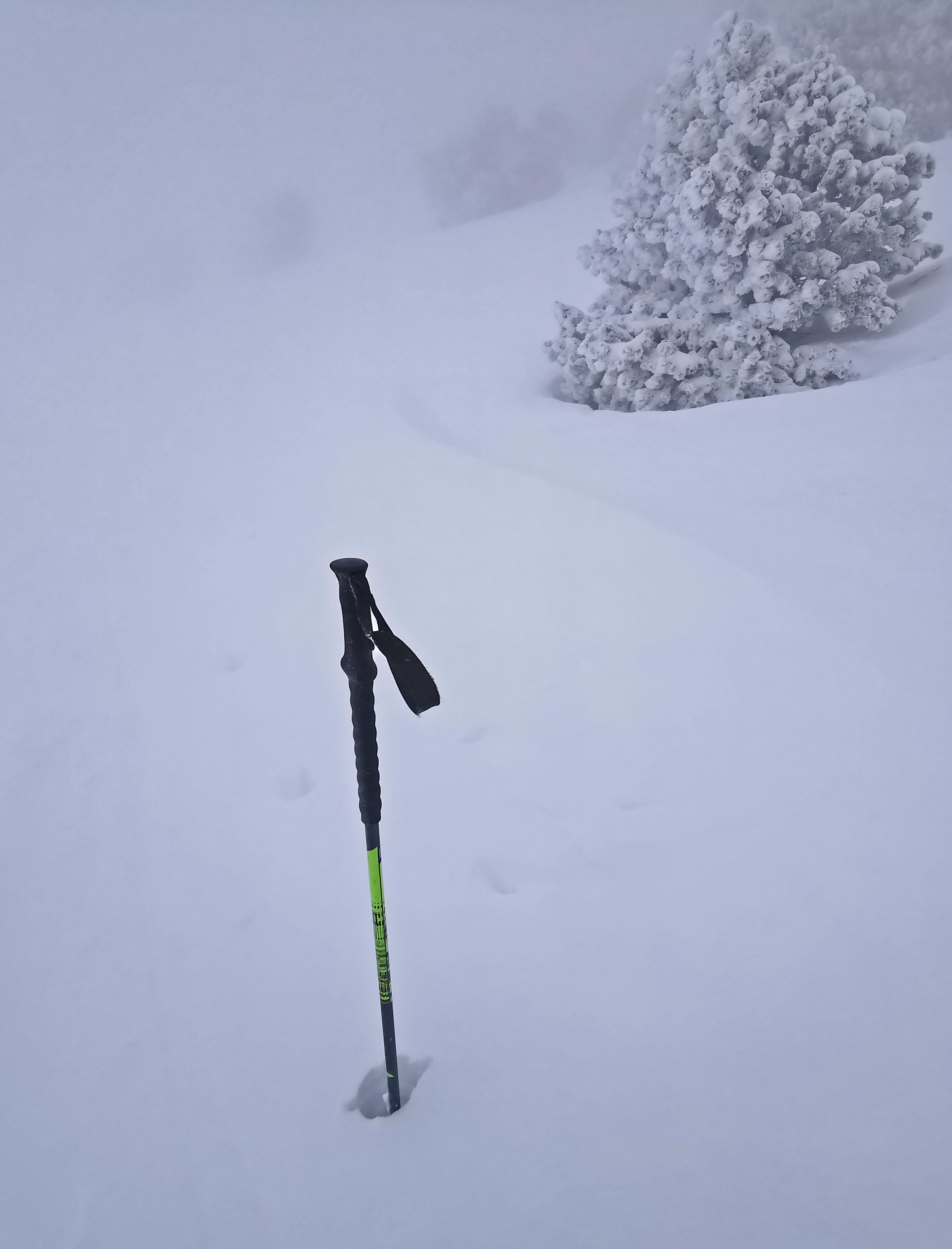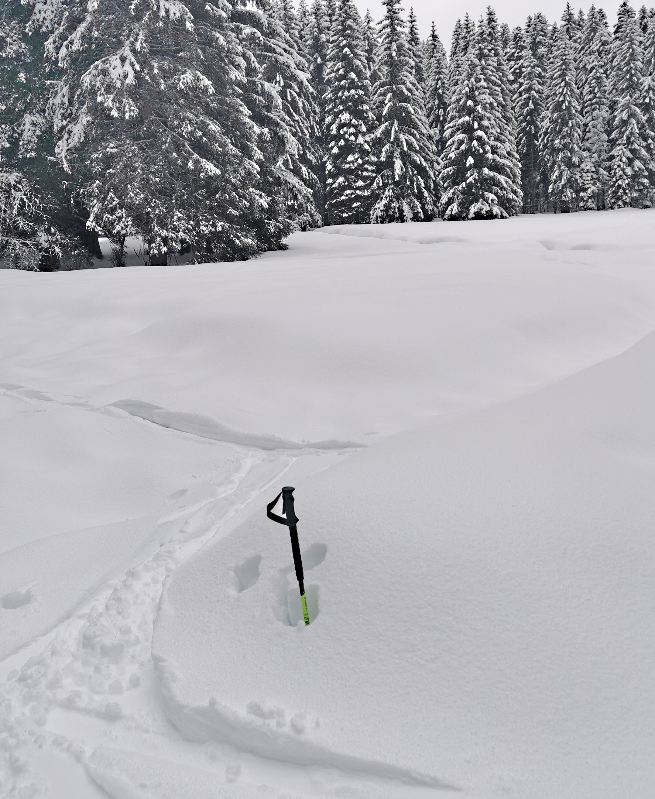 Encore une magnifique poudre sur 600 mètres de forêt suivant une zone sommitale bien enneigée mais sans visibilité d'où stop avant le sommet : peut-être skiable ce jour compte tenu de l'orientation des vents.