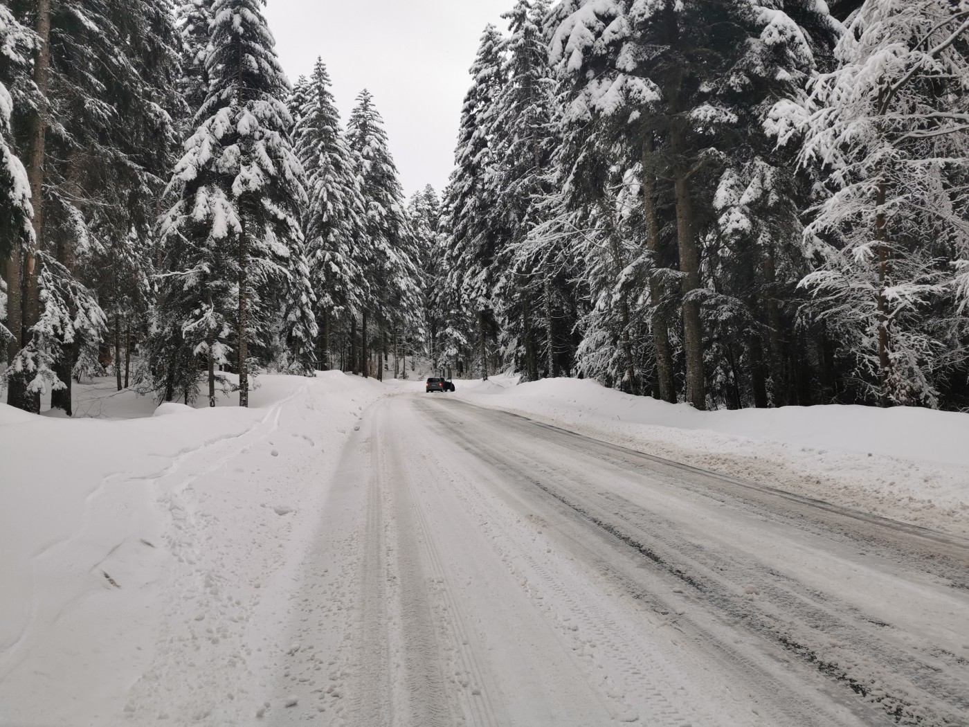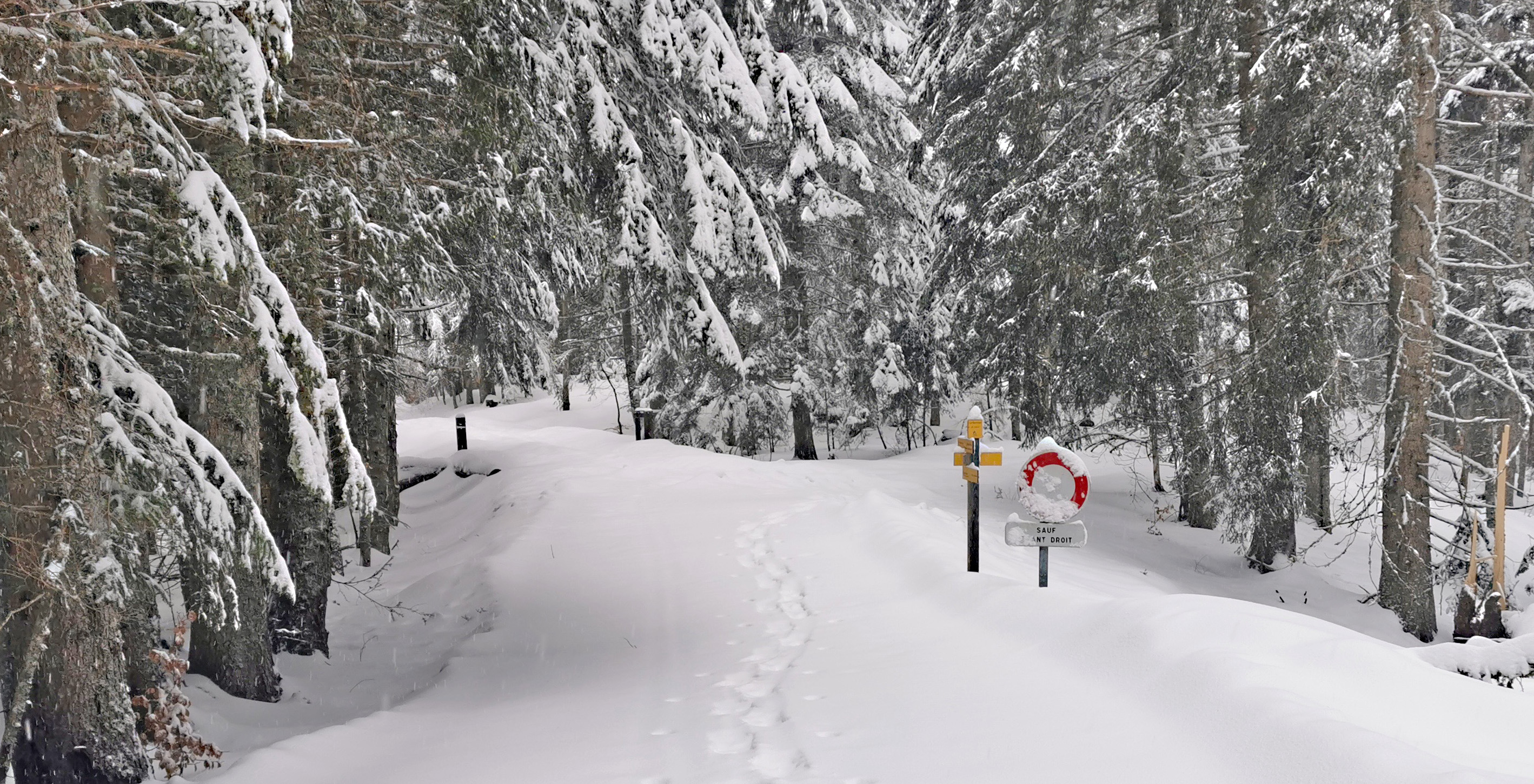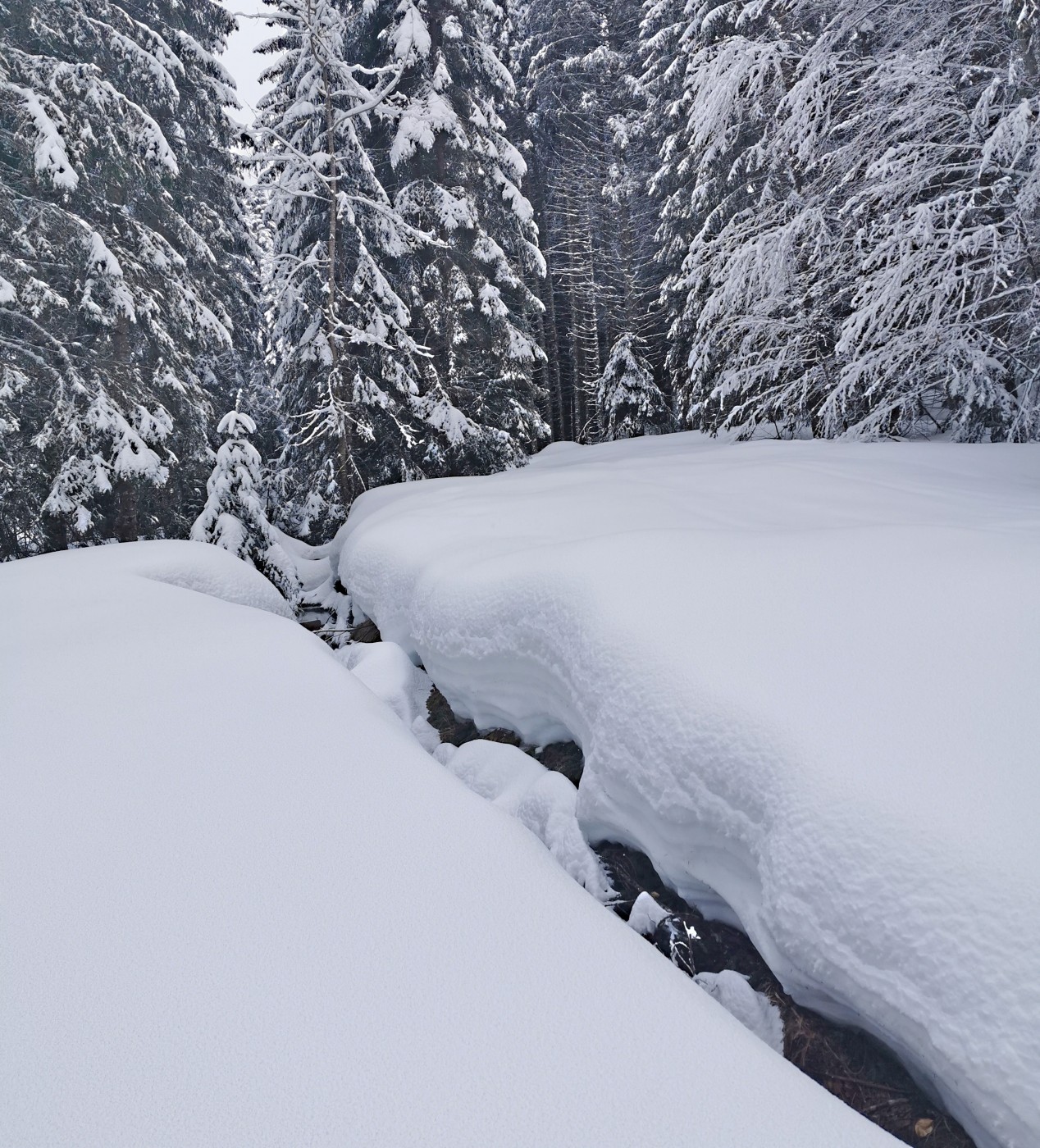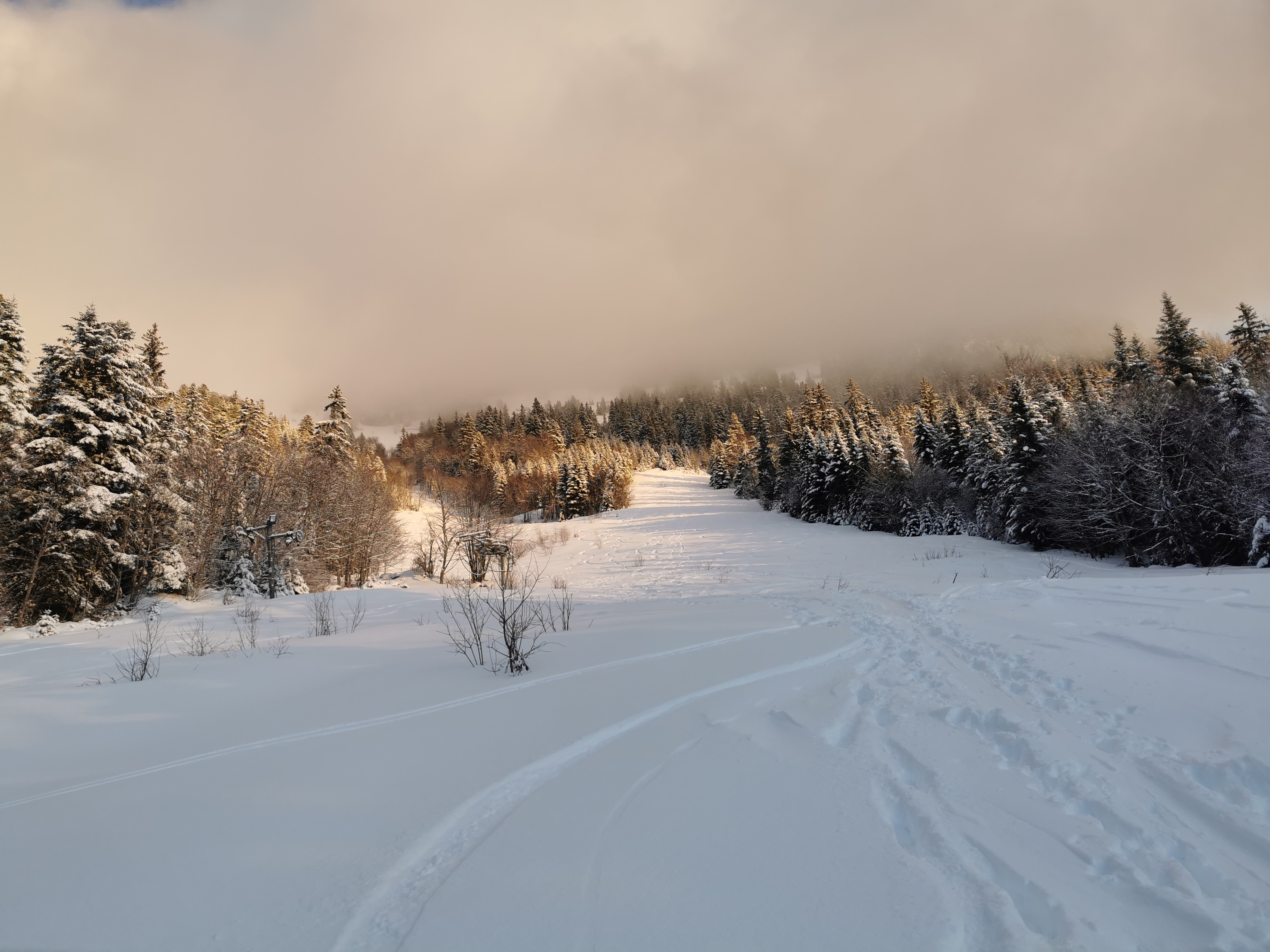 Encore une magnifique poudre sur 600 mètres de forêt suivant une zone sommitale bien enneigée mais sans visibilité d'où stop avant le sommet : peut-être skiable ce jour compte tenu de l'orientation des vents.