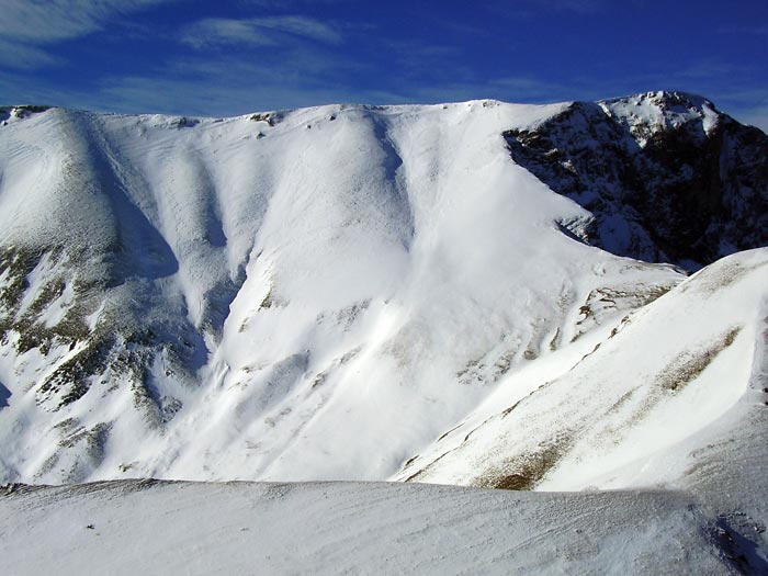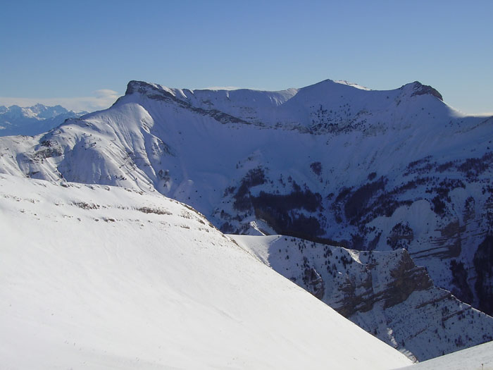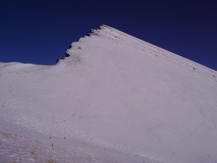 Au col de Chétive, sur son versant ouest, une belle plaque s'est décrochée, sur 20 m de large et plus de 50 cm d'épaisseur pour s'entasser dans le torrent de Chétive, laissant l'herbe apparente. Je l'ai remarquée à la descente, mais je ne peux pas dire si elle s'est décrochée après mon passage à la montée ou si elle était déjà partie. Montée un peu délicate dans la combe est, dont le creux est très étroit et soufflé-plaqué de haut en bas. À skis, j'affaissais le manteau ; j'ai donc remonté le creux à pied, en cherchant les endroits encore profonds en rive droite.