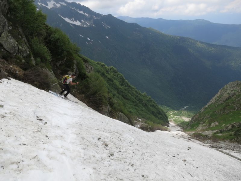 Une seconde étape qui a comblé toutes nos attentes malgré la fatigue de la veille et la chaleur. Pas besoin de skis cailloux dans le bas du Pertuis en skiant prudemment. On déchausse pile au niveau du lacet du sentier à 1550 m. Dément!