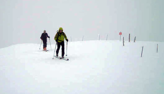 Relativement peu de neige dans le secteur. l'arrivée à skis sur route au cuchon à la sortie des Portiers est limite. les talwegs ne sont pas remplis. les vernes ne sont pas couchées. les piquets de l'arête eux dépassent parfois à peine du fait du travail du vent [(voir photo 3 ici) -> http://www.volopress.net/volo/sortie1198.html#pic)] . Les quantités sont dans l'ensemble sensiblement inférieures à la Chartreuse y compris en terrain dégagé. La croute sous la dernière poudre ne porte à skis qu'en dessous de 1500.