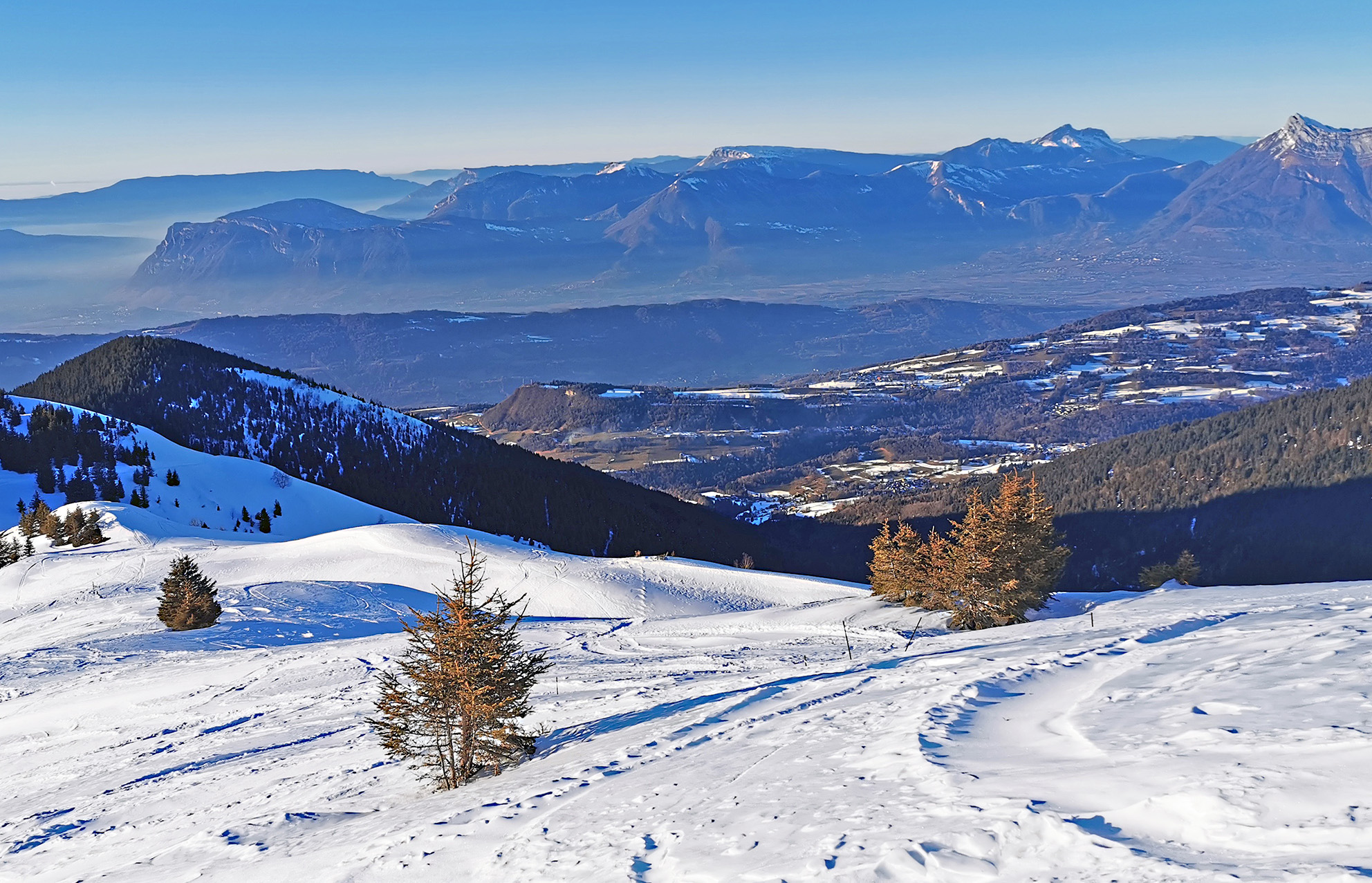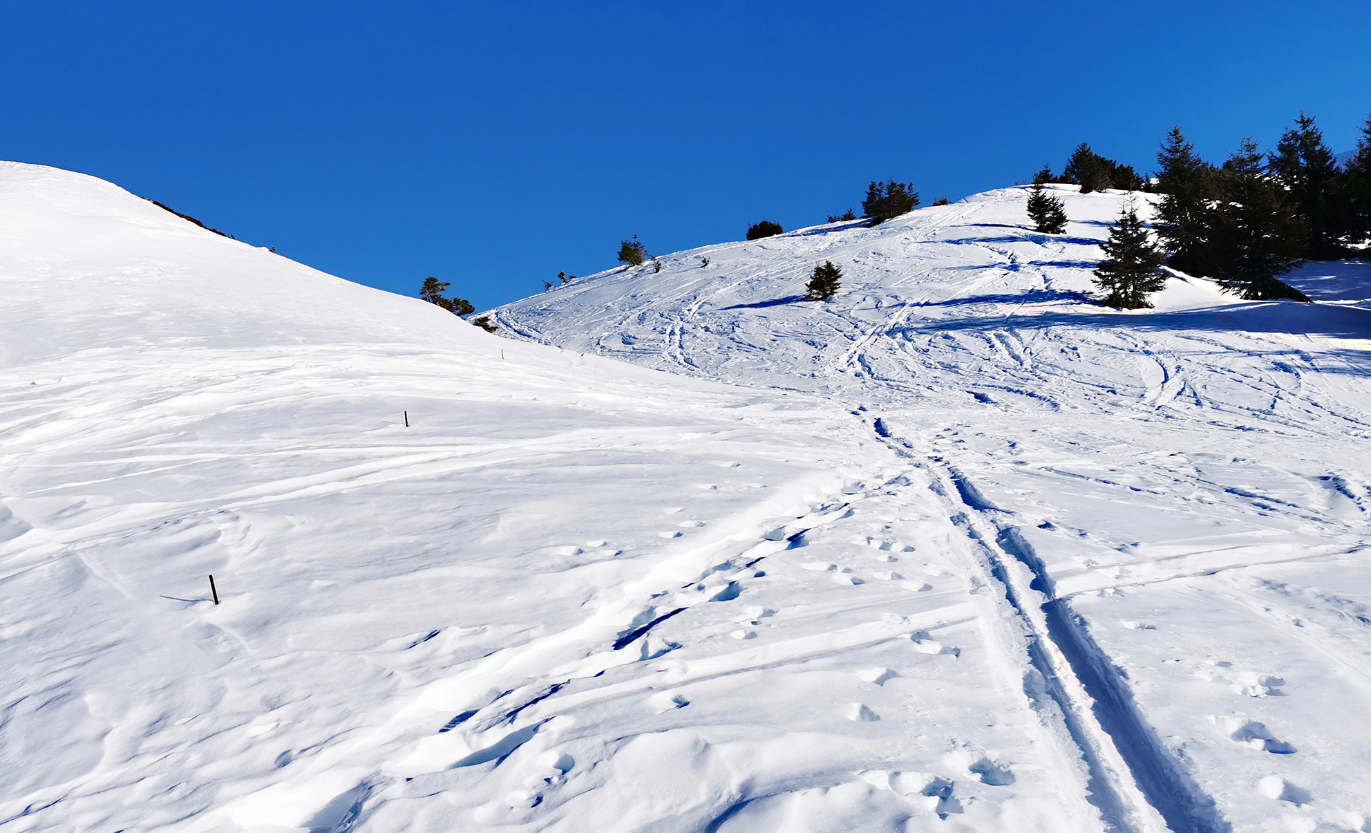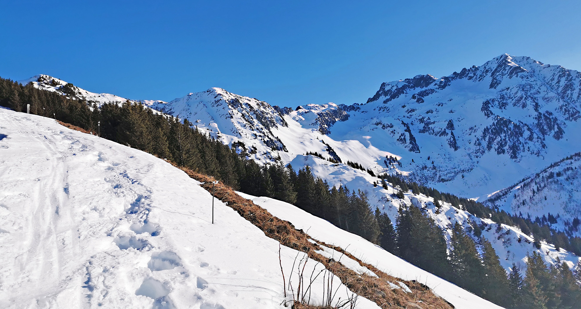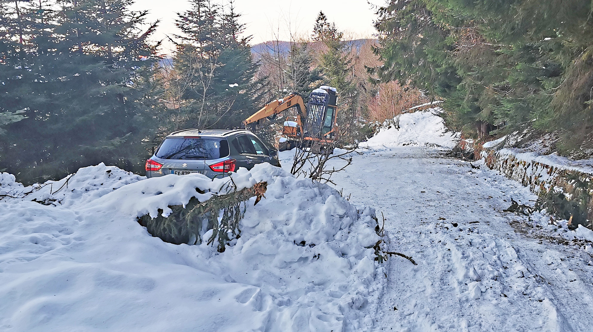 L'absence de neige en forêt sous 1400 allonge sérieusement la partie sur route (8 km l'aller simple ?). J'ai opté pour le départ des Portiers qui passait intégralement sans déchaussage mais il était possible de gagner 2 km (et 150 m de d+) : un skieur a saisi l'occasion. A voir pour les prochains jours ?