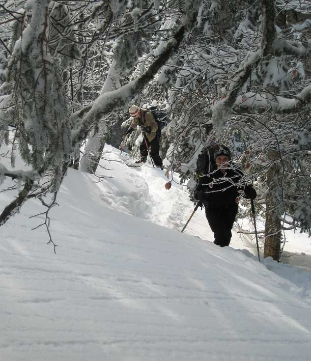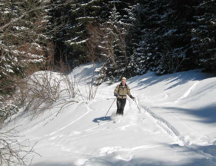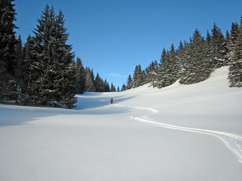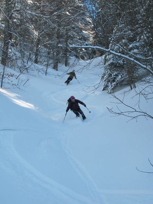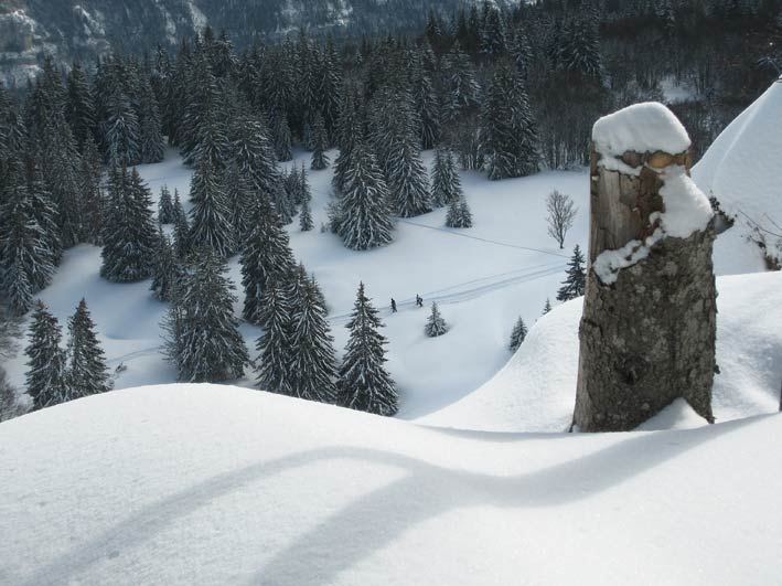Pas la foule mais des traces dans toutes les montées et aucune dans nos descentes. Poudre époustouflante à skier aussi bien en pente faible que plus raide. Nous avons emprunté la trace de montée du pas de Bellecombe. OK avec les conditions de ce jour, mais la plaque traditionnelle repartira surement soit à la prochaine grosse chute, soit au prochain réchauffement.