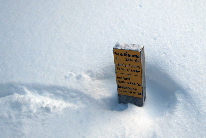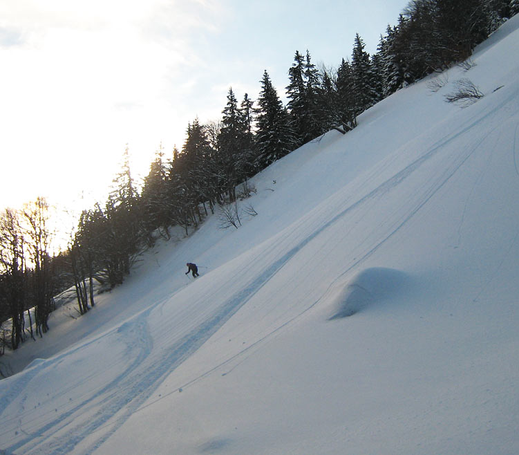 stabilité parfaite même sur bossettes >40° à proximité de la crête. bonne adhérence de la couche récente (50 cm) sur une sous-couche regelée mais tendre et granuleuse. L'enneigement semble un peu plus important au sud du pas de Bellecombe qu'au nord. Les gros blocs de la plaque de décembre au sud du pas étaient presque invisibles