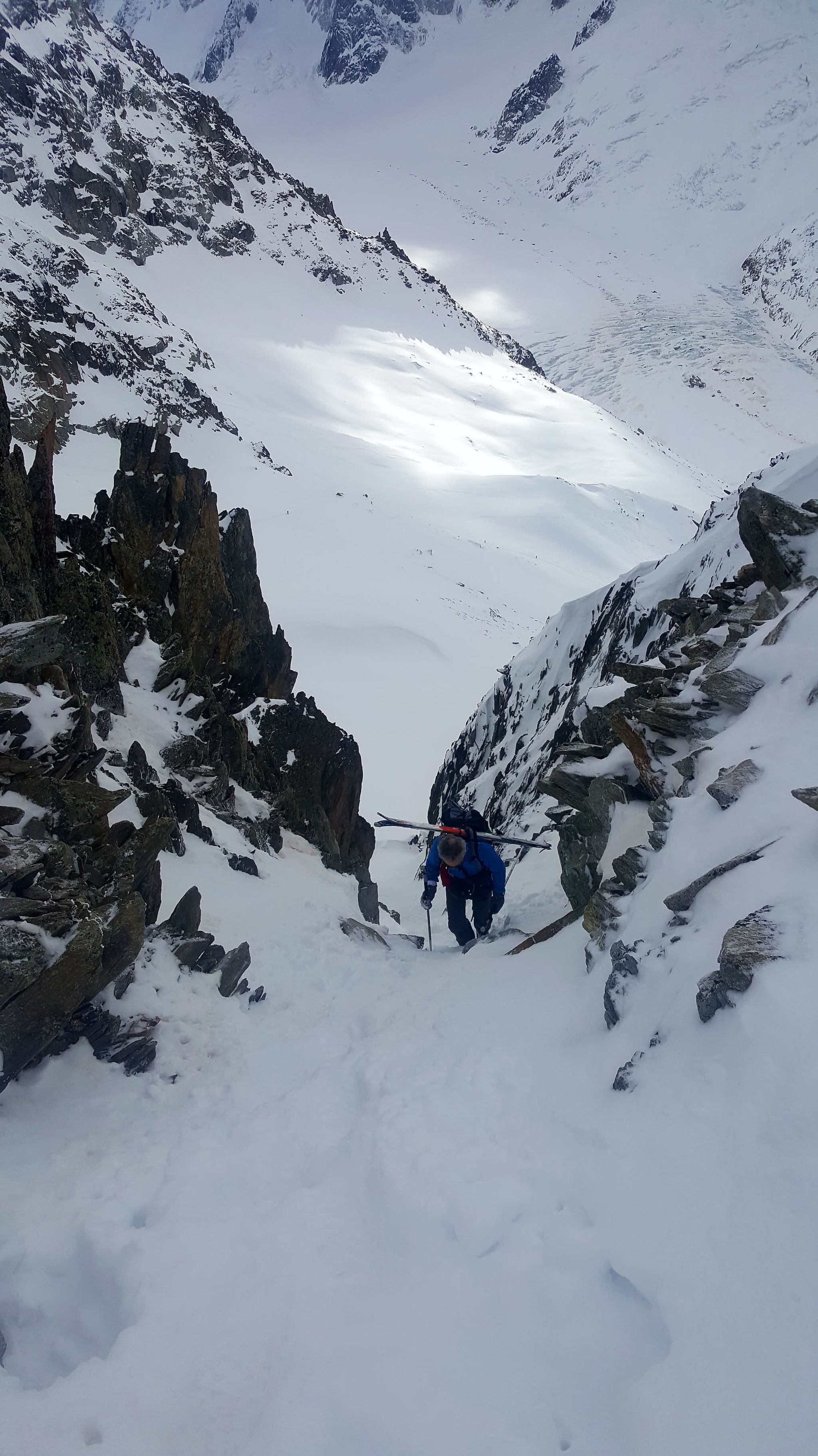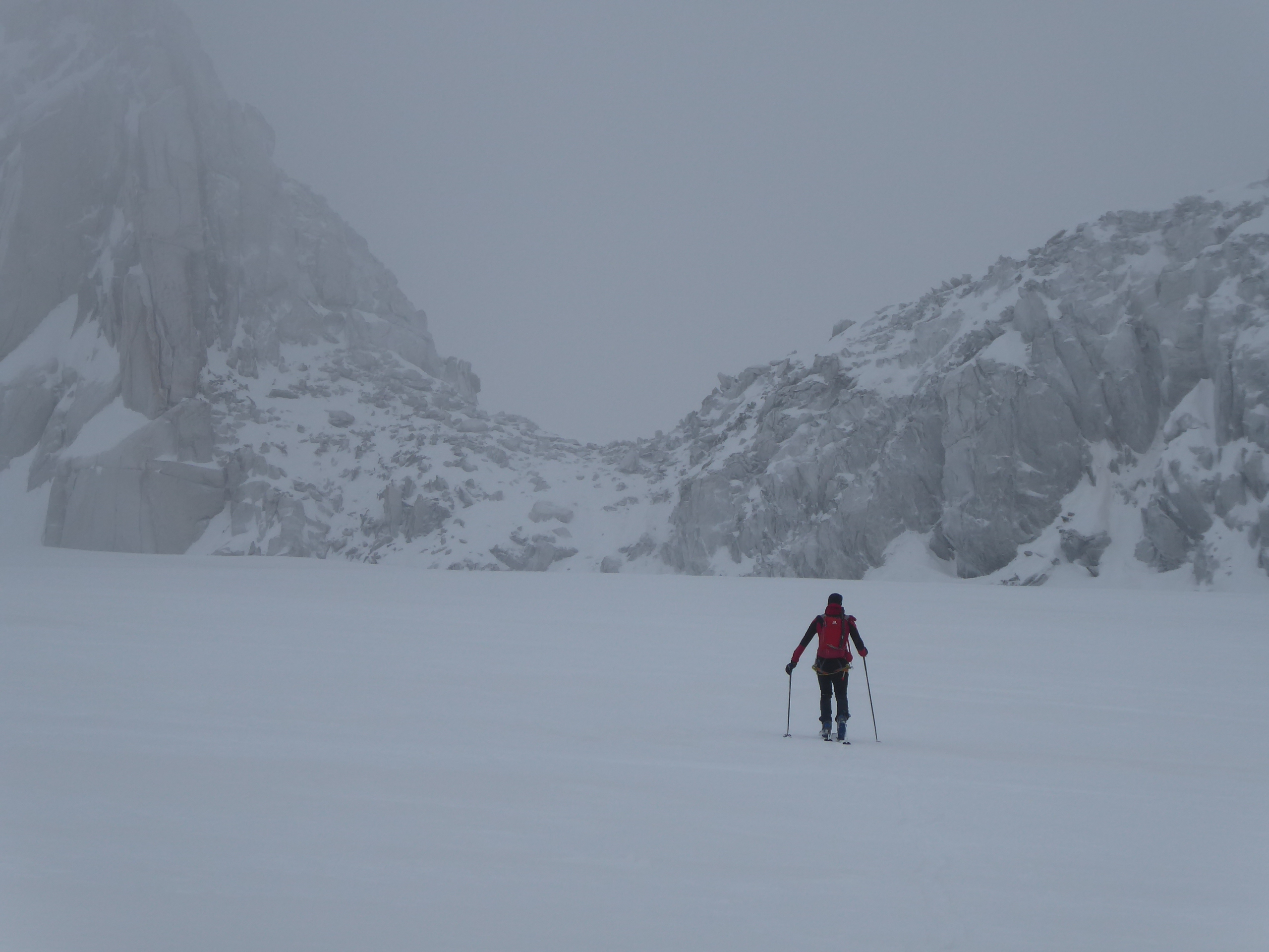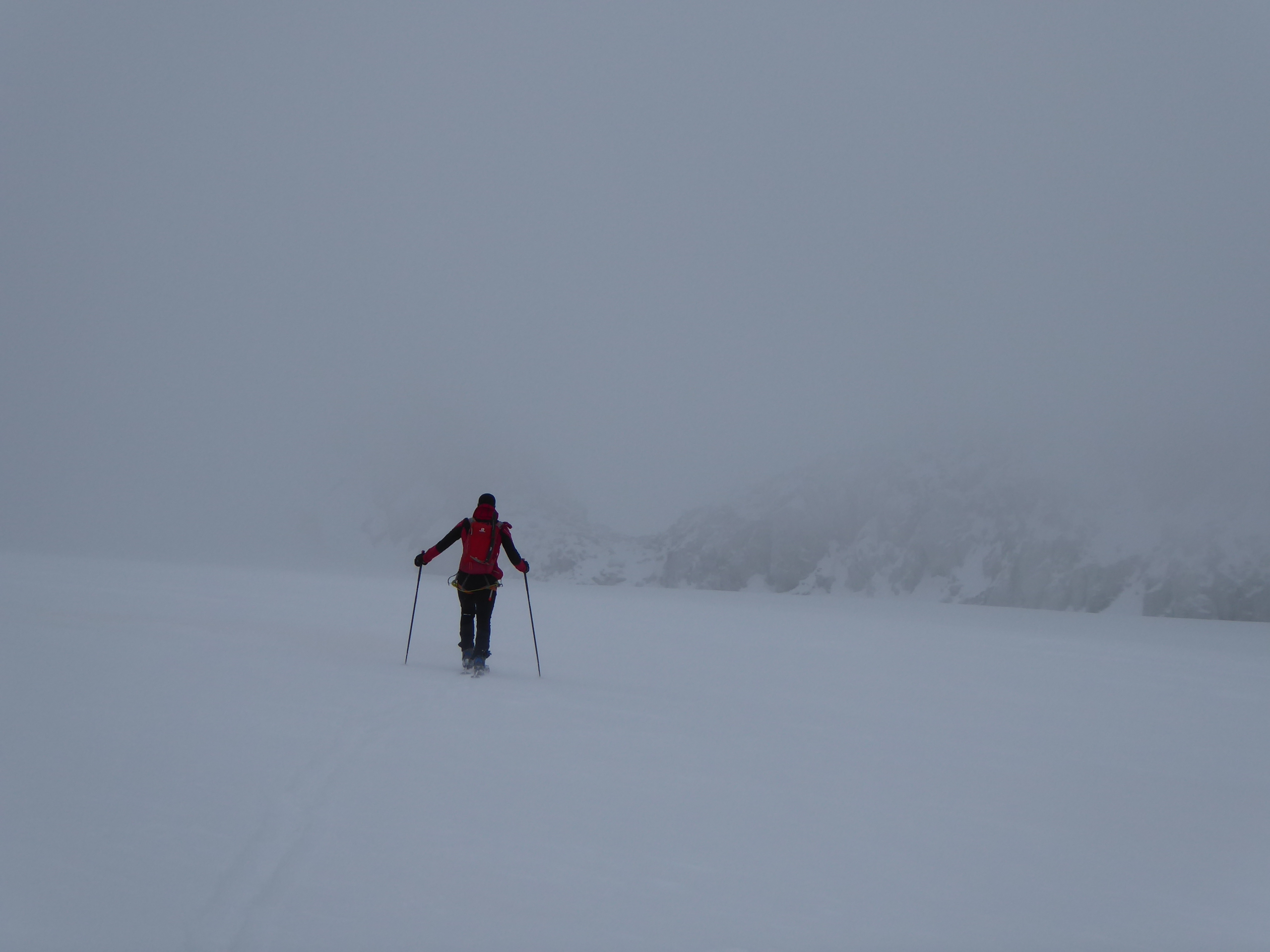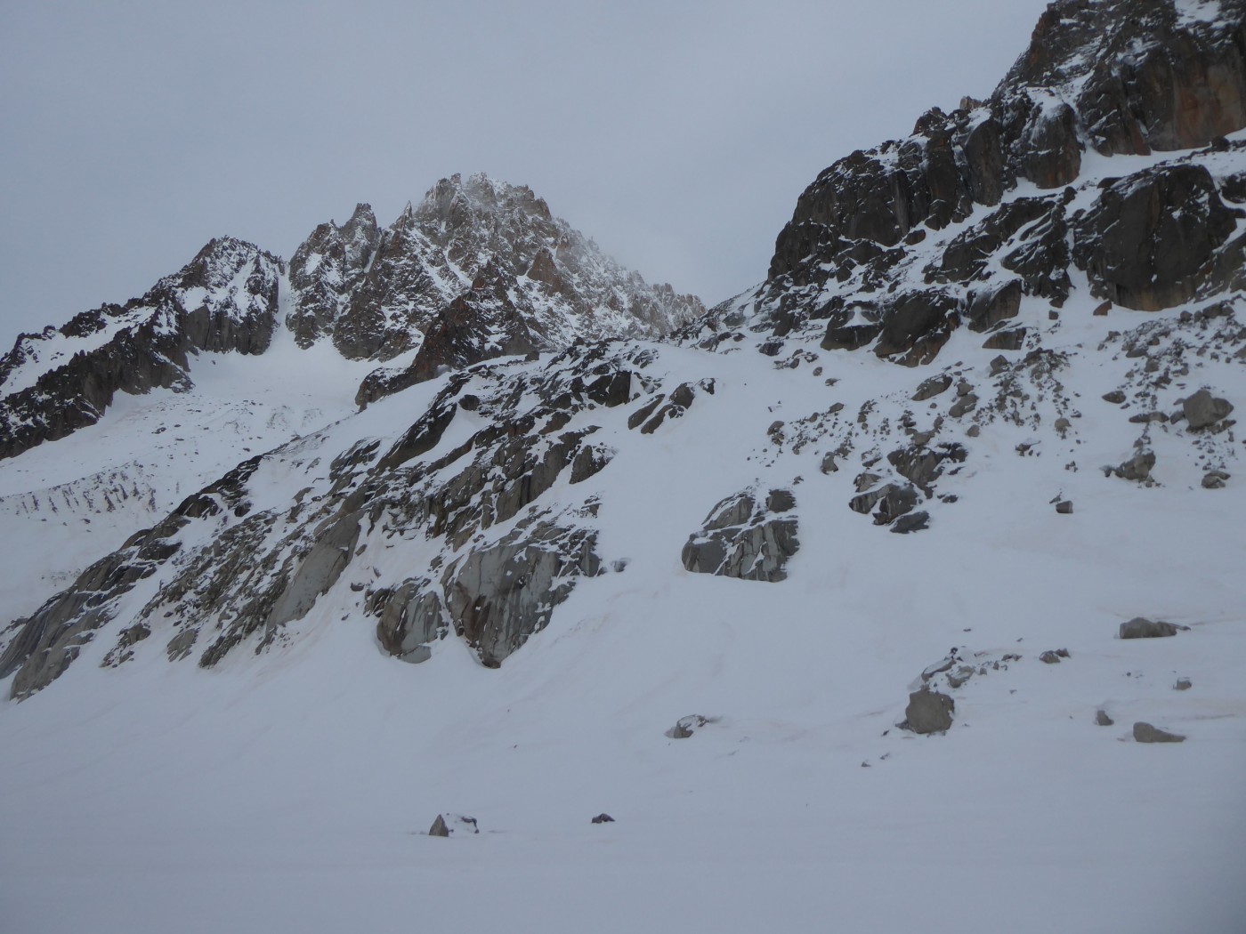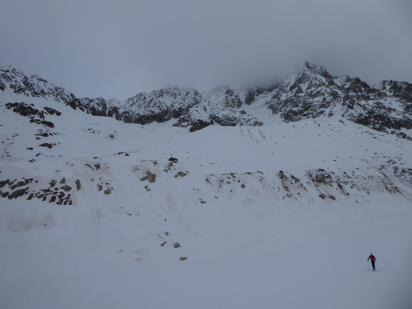 Dommage que le temps n'ait pas été meilleur. Nous avons quand même pu naviguer à vue malgré les nuages. Montée au col du Passon en bonnes conditions (bonnes marches, crampons pas nécessaires). Vu que le glacier a perdu en épaisseur, nous avons pris l'option d'enlever les peaux pour descendre du col du Passon sur le glacier du Tour. Crevasses et rimayes bien bouchées. Gros brassage dans la montée au col du Chardonnet.