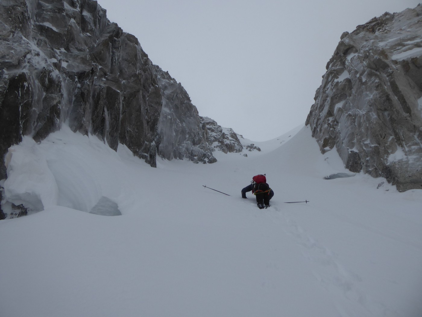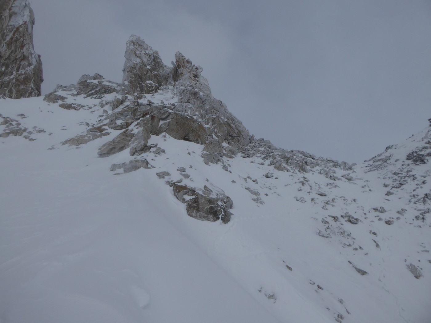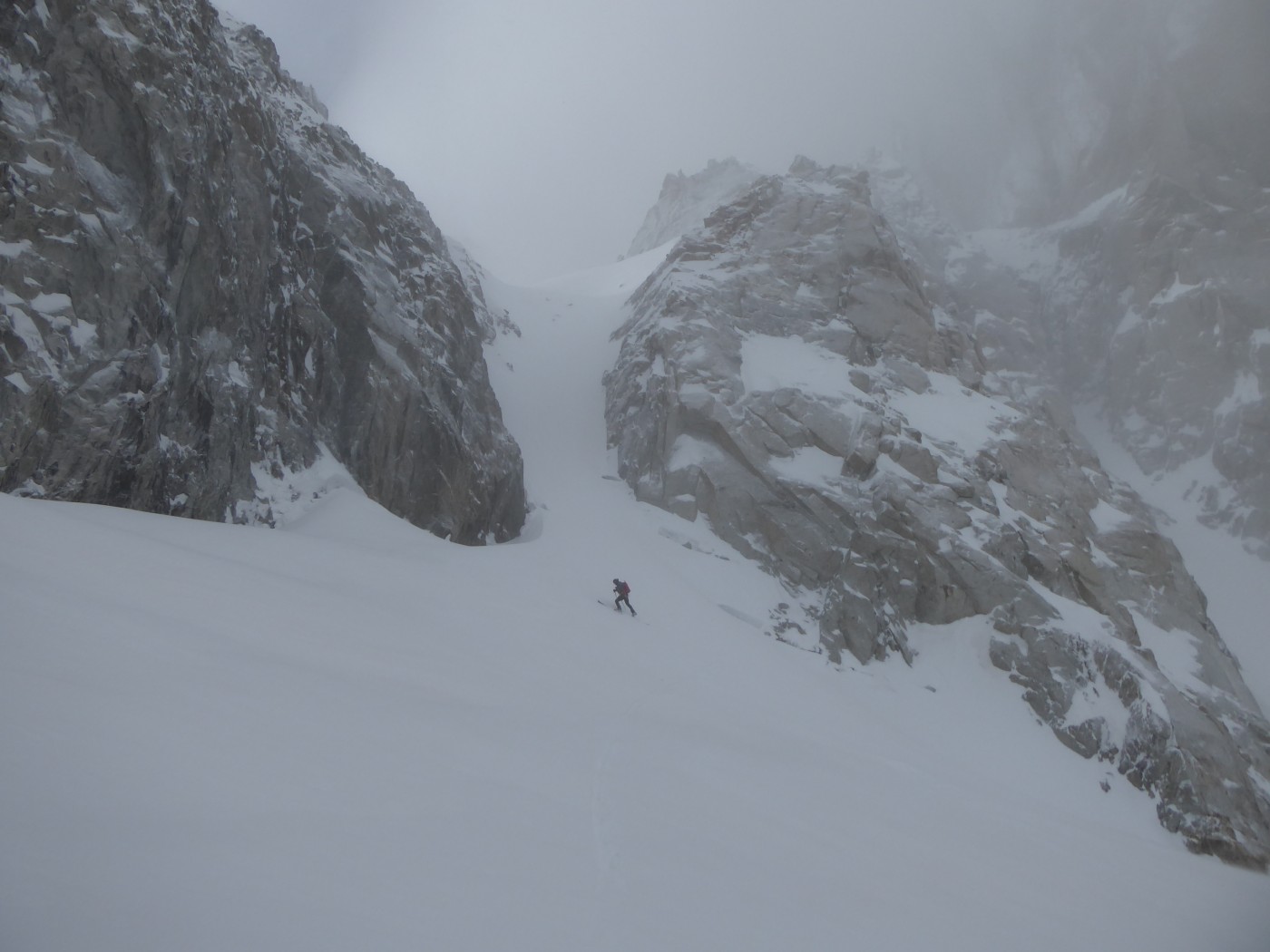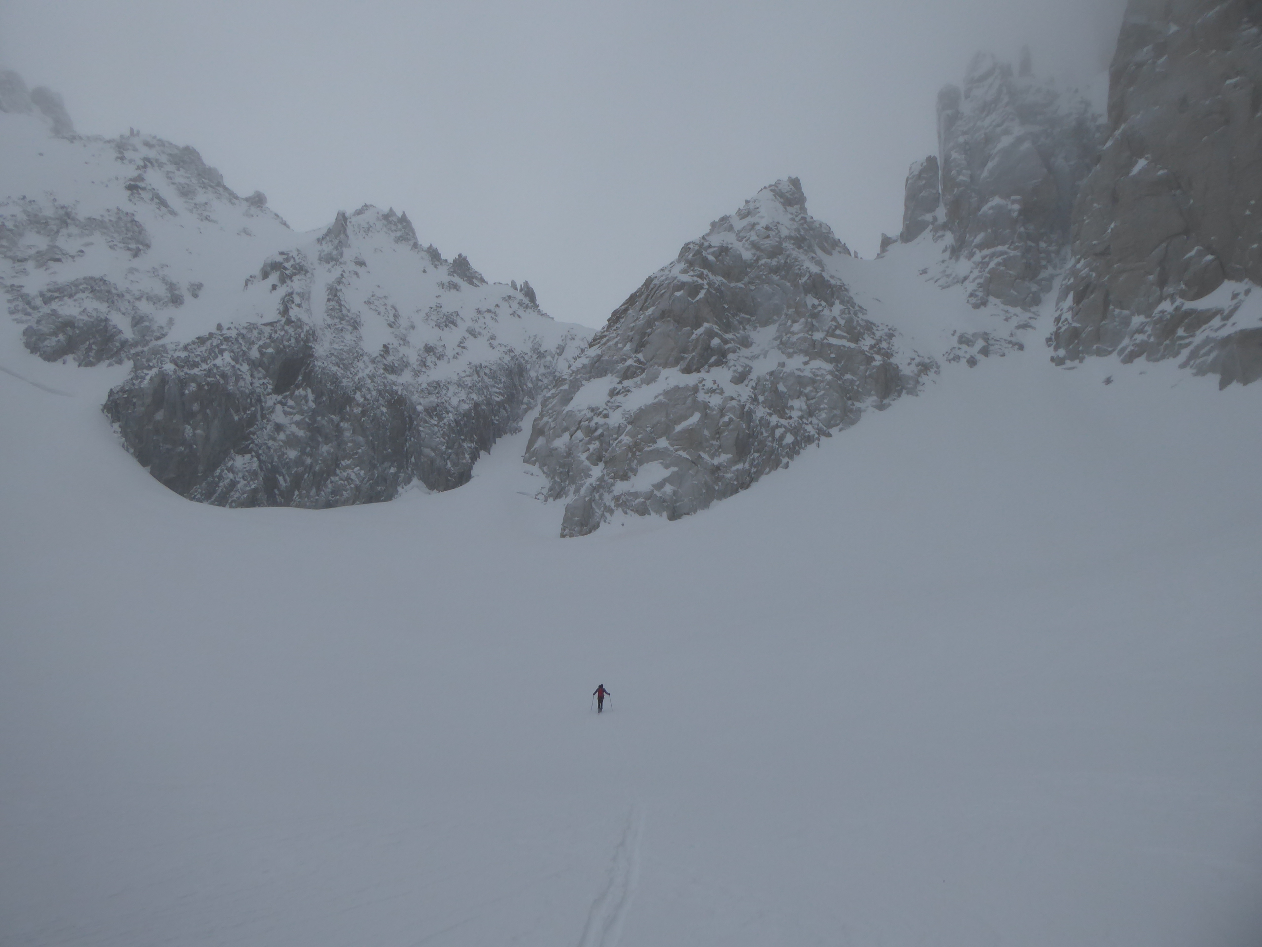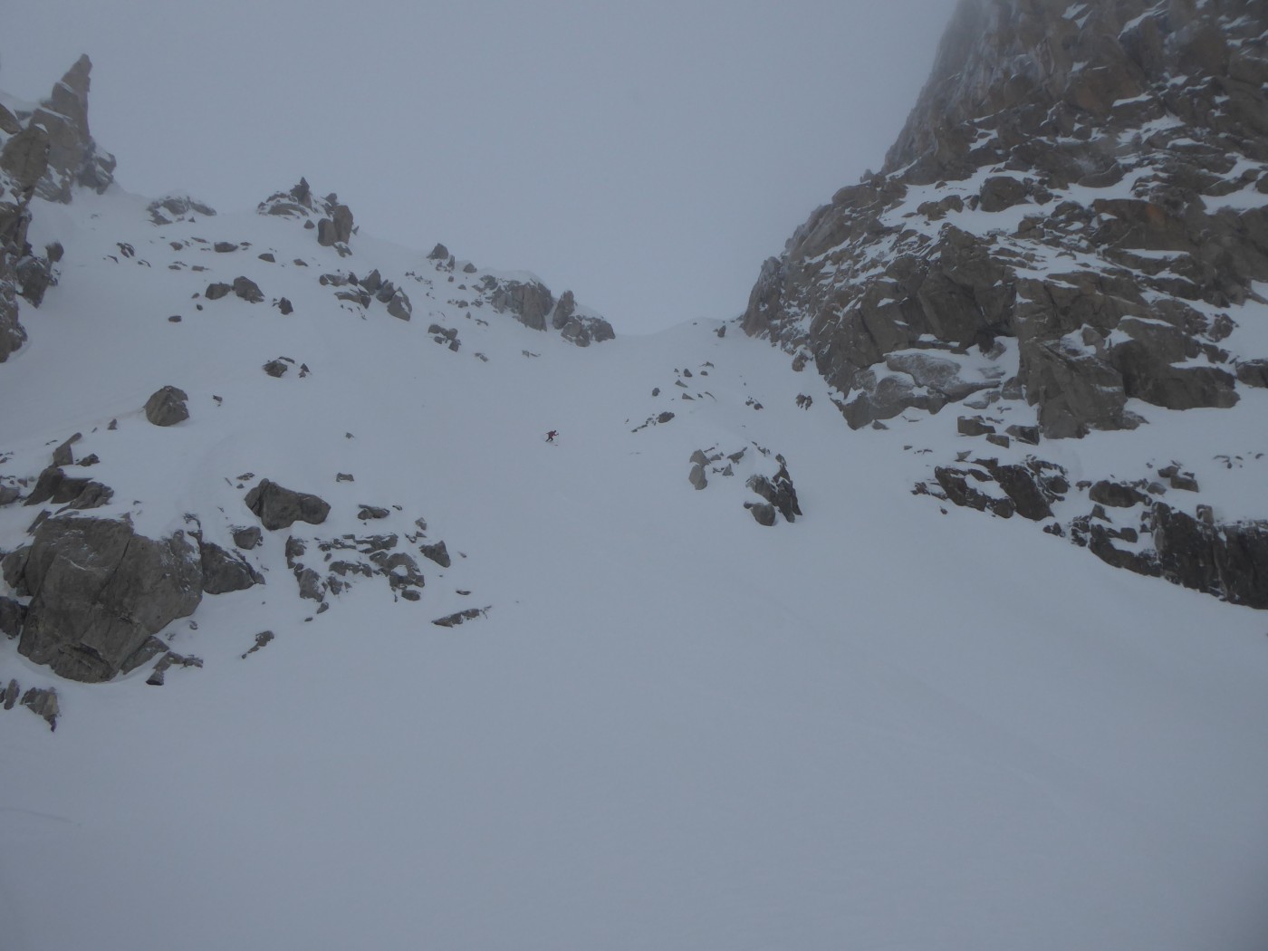 Dommage que le temps n'ait pas été meilleur. Nous avons quand même pu naviguer à vue malgré les nuages. Montée au col du Passon en bonnes conditions (bonnes marches, crampons pas nécessaires). Vu que le glacier a perdu en épaisseur, nous avons pris l'option d'enlever les peaux pour descendre du col du Passon sur le glacier du Tour. Crevasses et rimayes bien bouchées. Gros brassage dans la montée au col du Chardonnet.