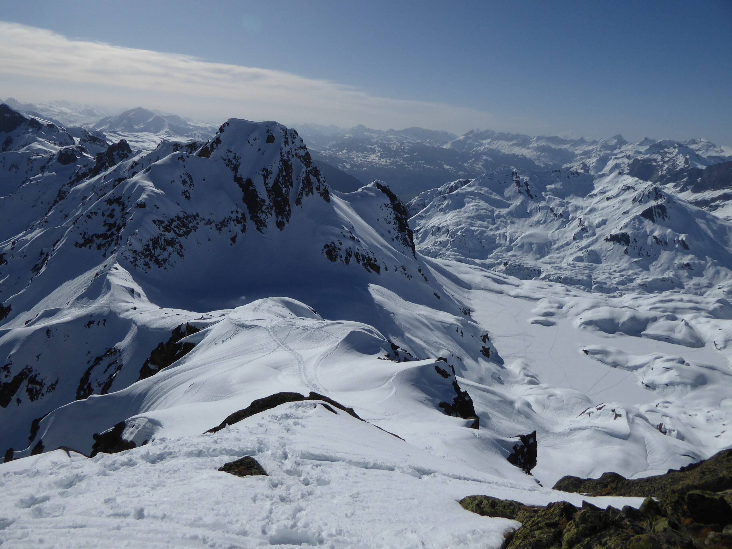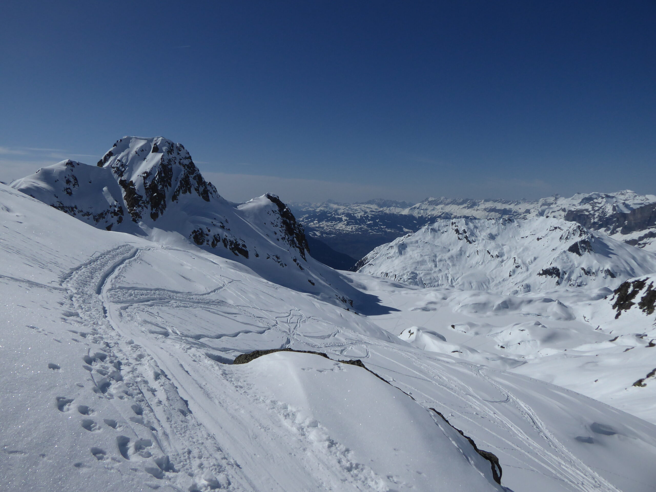 Flégère, descente au TS des Evettes montée au col de la Glière, descente sur le lac Cornu, remontée à la Charlanon, descente de la combe nord sur le lac Cornu, remontée à l'aiguille Pourie par l'arête sud-ouest
