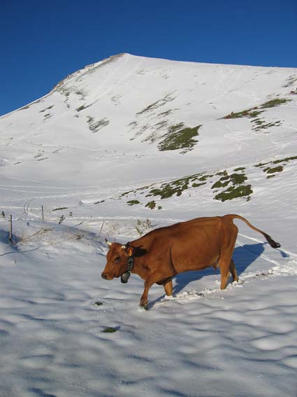 Je n'avais pas du tout l'intention d'aller si bas mais j'ai été pris dans l'élan en voyant le col de la charmette enneigé. La neige très compactée a rendu possible cette descente. Bonne, (on ne touche pas) jusque vers 1600 m (bifurcation vers la vire nord de la montée de B14) ; correcte (il faut sérieusement ralentir pour ne pas toucher ) jusqu'à 1400 m (zone de rephoquage de B8) ; archi-limite en-dessous jusqu'à la Charmette (ne passera plus avec la fonte de l'après-midi et le ruissellement des arbres). Le versant est était déjà humidifié à la dernière montée ainsi que la dernière descente, excellente. La voie normale , plus raide (première montée) devrait rapidement perdre toute sa neige. Les tarines étaient montées rider à mi-hauteur, confirmant la réputation de montagnes à vaches du Charmant Som.
