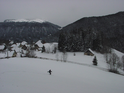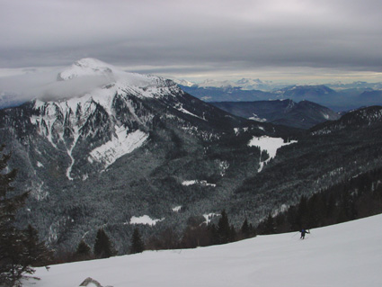 neige abondante sur toute la descente, très bonne skiabilité malgré un début d'humidification : les torrents sont bouchés; les rochers et les souches bien amortis ; on peut se lâcher et passer n'importe où. Descente prudente sous la crête au début puis dans la grande clairière en restant sur le bord gauche. Tentatives infructueuses de déclenchement accidentel. neige semblant plutôt devoir partir naturellement par réchauffement.