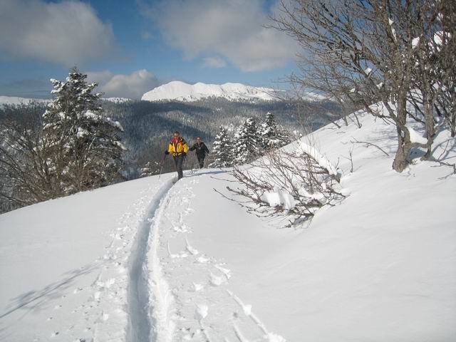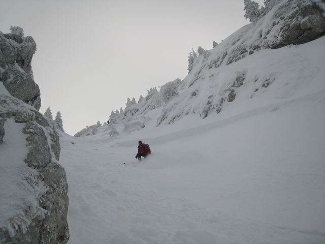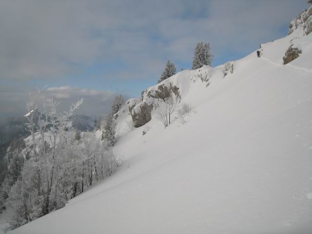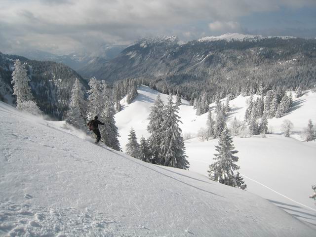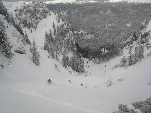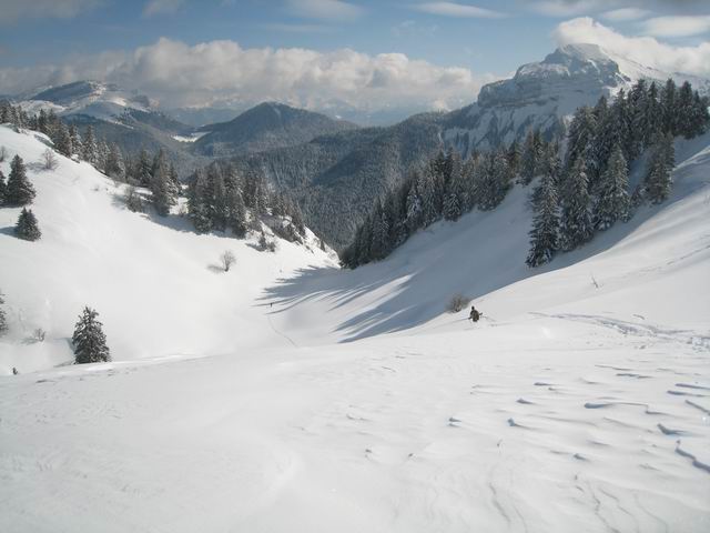 On s'était dit qu'on adapterait l'itinéraire, on a adapté. Après une entrée minutieuse dans la combe ouest, Manu en commence tout doucement la descente mais provoque une cassure de 50cm dont il s'échappe par coté. Tout est parti, on descend à Pré Batard et remontons voir l'If, mais c'est vraiment chargé et comme une fois dedans pas de possibilité de s'échapper sur le coté au cas où, on abandonne. Retour tanquille au Charmant Som, la forêt est superbe, inutile de forcer le destin ! Un peu frustrés quand même, on ira s'offrir avec Manu, sur le chemin du retour, un AR à la Pinéa dont la forêt est toujours aussi excellentissime