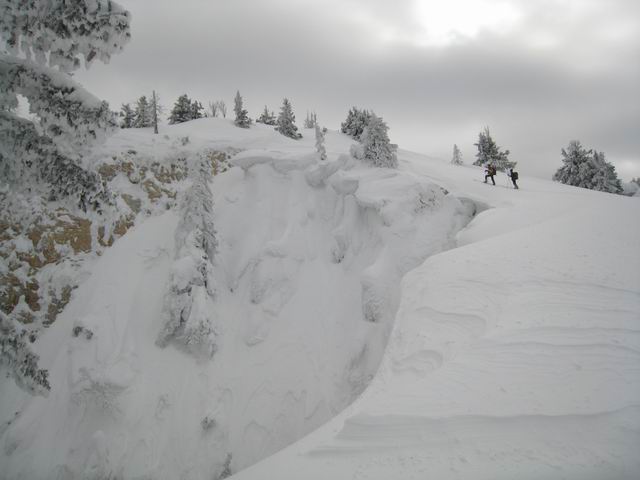 Plus de neige fraiche en Chartreuse interieure qu'au Sappey. Même quantité totale (110cm) aux Cottaves (correct), qu'à Pré Batard (pas terrible). Globalement hier, toute la neige récente avait pris beaucoup de cohésion, mais pas avec les couches inféreiures, ça se fissurait en bloc sitôt que la pente se redressait, le risque 3 nous a semblé un peu limite, en tout cas pour la Chartreuse. Manu a failli en faire les frais, cf commentaires