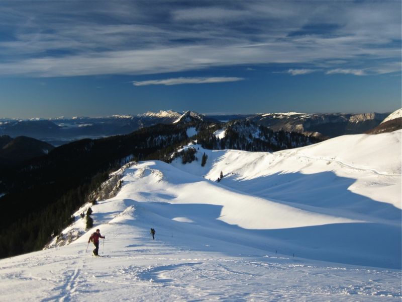 Partis pour toucher la neige et faire quelques photos de l'aube, nous sommes surpris par la qualité du manteau au-dessus de 1500 m et nous laissons entraîner jusqu'au col de la Charmette. Un beau petit circuit "dépaysant" de Chartreuse "comme on l'aime" pour une reprise. Les deux descentes (combe NW jusqu'à la Charmette) + face sud classique on été faites sans se soucier des cailloux et sans aucune touchette ! Incroyable pour la date 5 jours après la tempête.