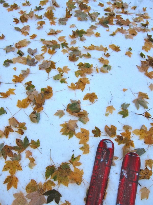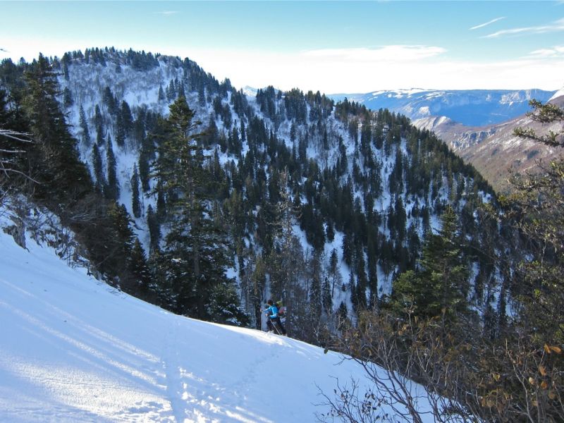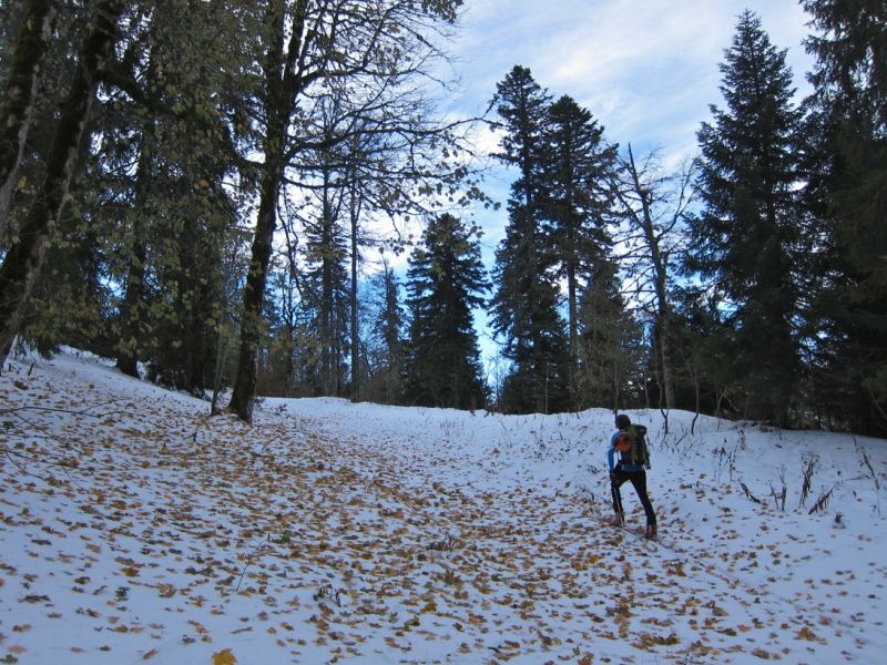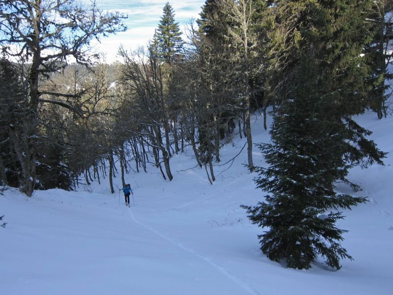 Ski exceptionnel (grandes courbes de poudre) pour la date dans le couloir NW jusqu'au pré Bâtard ; croûte de pluie alourdissant l'ensemble avec le réchauffement de la matinée en forêt sous 1450 m : pas dément mais relativement bien skiable avec 99 au patin (mais pas avec 70 !)