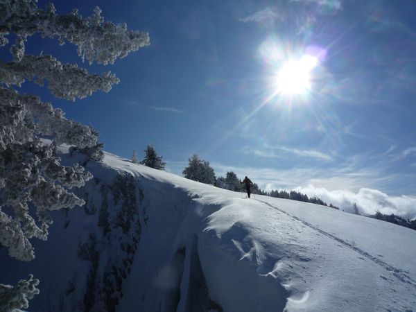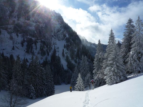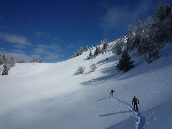 Beaucoup de "wouf" lors de notre traçage dans les zones plates. La sous couche croûtée s'écrase sous notre poid lors des zones "à bulles d'air" formées par les rochers & arbres enfouis sour la neige.