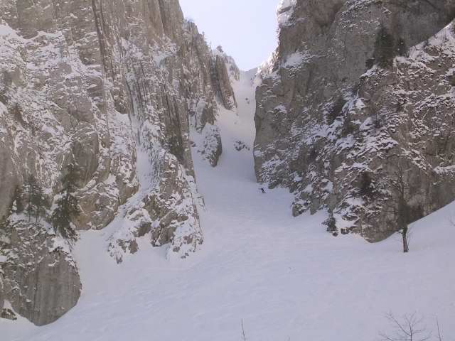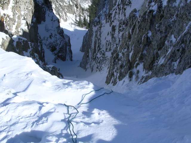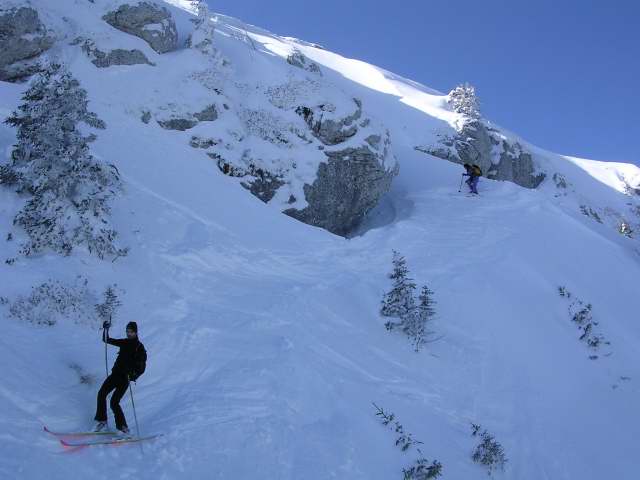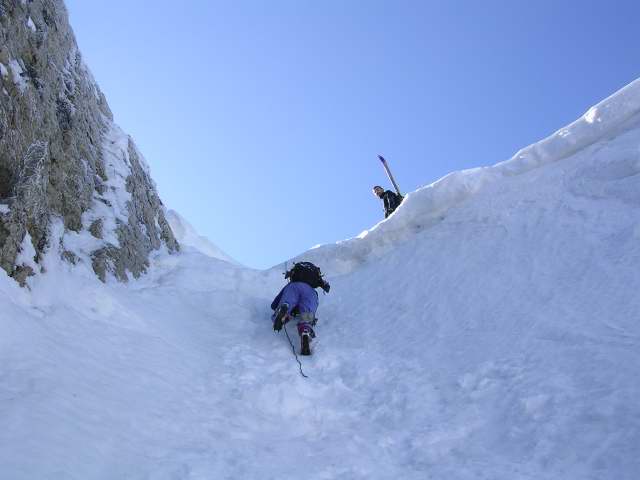 Cette boucle réalisée à 2 reprises par Ole semble bien fréquentée depuis:en preuve ce corps mort laissé à demeure permettant de poser un court rappel pour prendre pied dans le couloir..Au moins 2 passages depuis la dernière chute de neige.Le retour depuis le Habert de Malamille reste un tantinet longuet:gros coup de chaud en remontant la face E