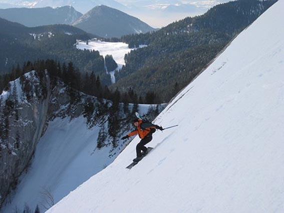 C'est vite torche. Dommage que le vent nous ait prive d'une neige un poil plus revenue, car les systemes de barres qui jalonnent la descente imposent la prudence. Ceci dit, le haut est superbe et tres aerien A noter les nombreux decrochements du manteau sur les dalles. Nous avons pu skie de haut en bas, mais ca ne va pas durer
