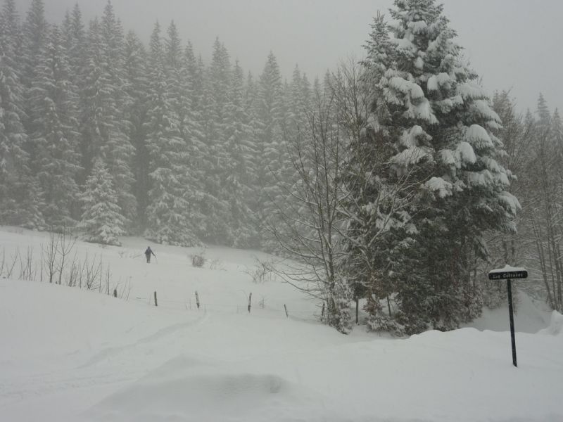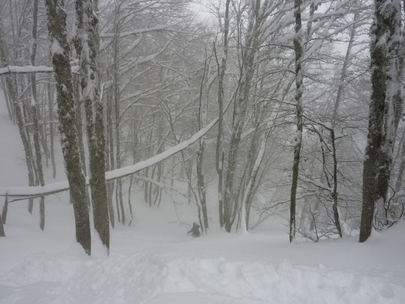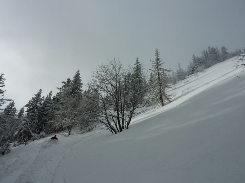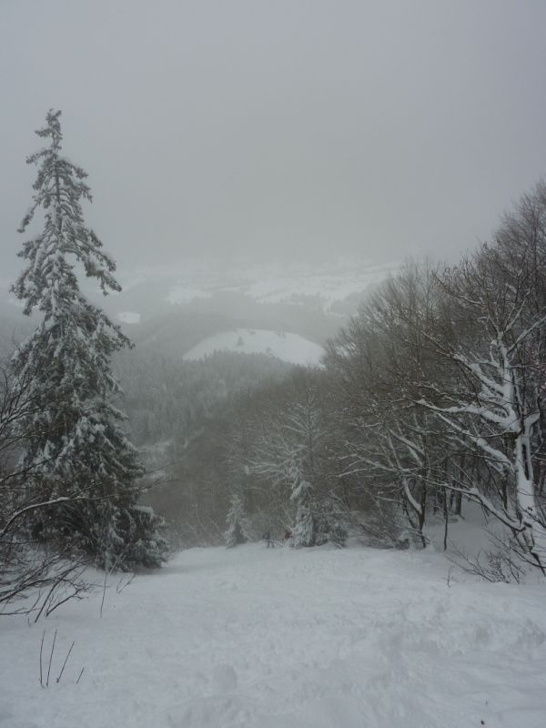 Les quantités de neige croissent de manière très importante avec l'altitude. D'où notre stop à la moitié de la seconde clairière, le mélange passage raide et grosse quantité de neige légèrement compactée par endroit ne nous inspirant pas. D'ailleurs la trace devant nous s'arrêtait là.