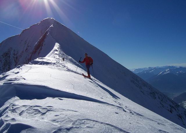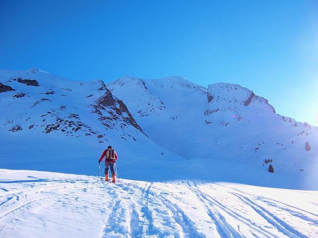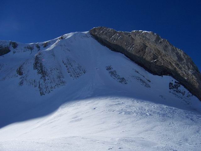 De la Savatte, montée à l'épaule par face ouest (I9), descente par le couloir nord-est (I10.1), retour par col des Porthets et remontée par I9 jusqu'au sommet, descente 100m en sud-ouest (I8), et bascule face ouest pour descente finale. Ce n'est pas un vrai 8 puisqu'on repasse 2 fois par le brin central, et Sergio donne une A.O.C à ce circuit qu'il baptise "boucle papillon". On aurait aimé descendre la sud-ouest jusqu'en bas, mais très vite on a trouvé de la croûte dans cette face, contrairement à la rive gauche de la face ouest en excellentes conditions. D+/- 1700m
