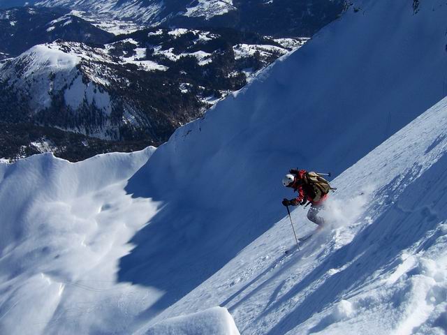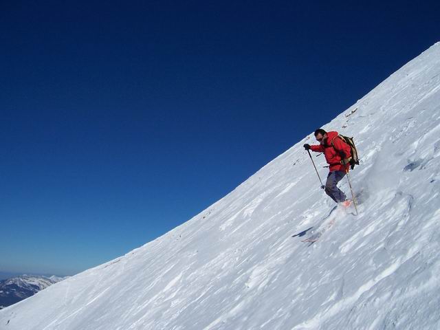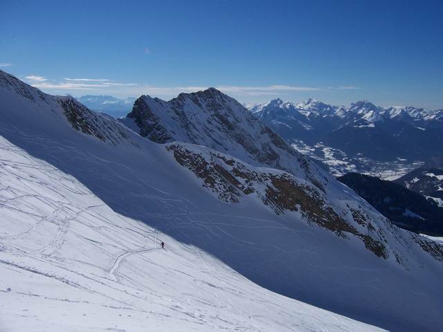 Ce Charvin est vraiment un beau sommet, impressionnant lorsqu'on en découvre le versant sud-ouest en venant d'Ugine, depuis le col de l'épine. La face ouest est manifestement beaucoup parcourue, mais en arrivant à l'épaule, nous avons la bonne surprise de voir que la nord-est n'était pas tracée. Plus glabalement, ce secteur de la Savatte est une vraie mine, et est le RV de nombreux randonneurs de toutes sortes. Il reste néanmoins des hectares de neige vierge, souvent à 2 pas des traces où la plupart s'agglutinent