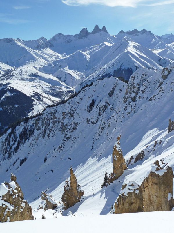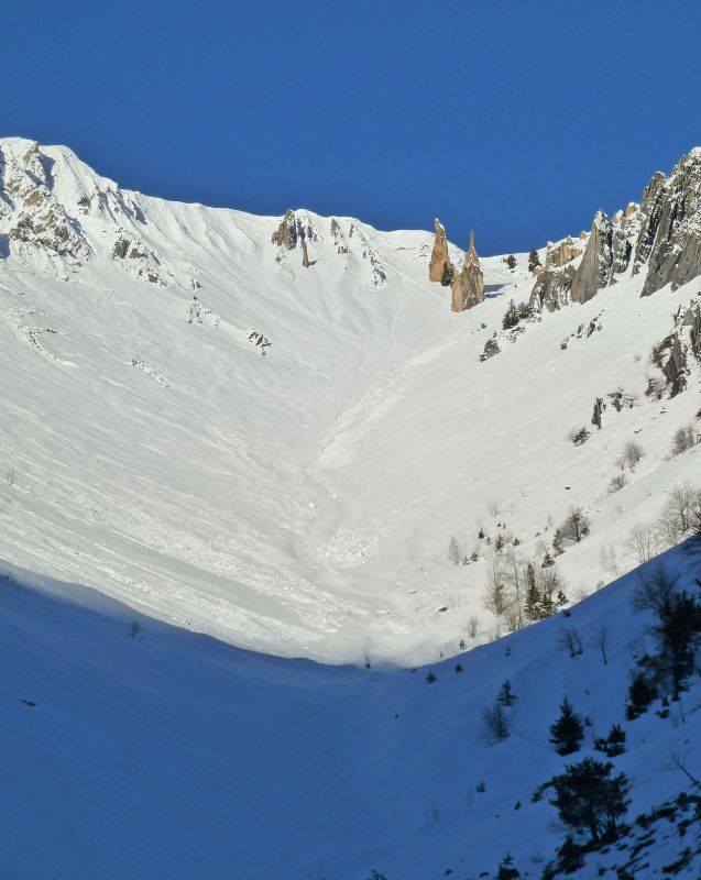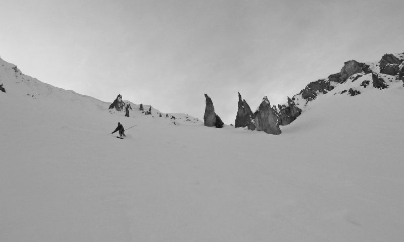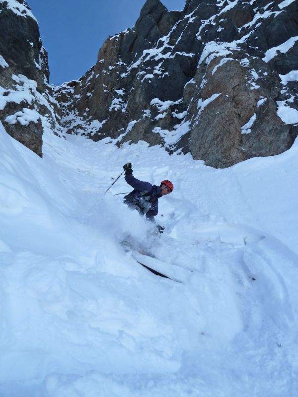 Excellentes conditions ce jour dans la combe Génin (depuis le sommet, 900 m de grosse poudre en rive droite, à 30-35°), moins dans le couloir NO où même si nous n'avons pas déchaussé, le ski a été haché : entrée en matière délicate, étroiture centrale et crochet inférieur pour éviter le ressaut.