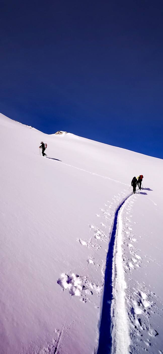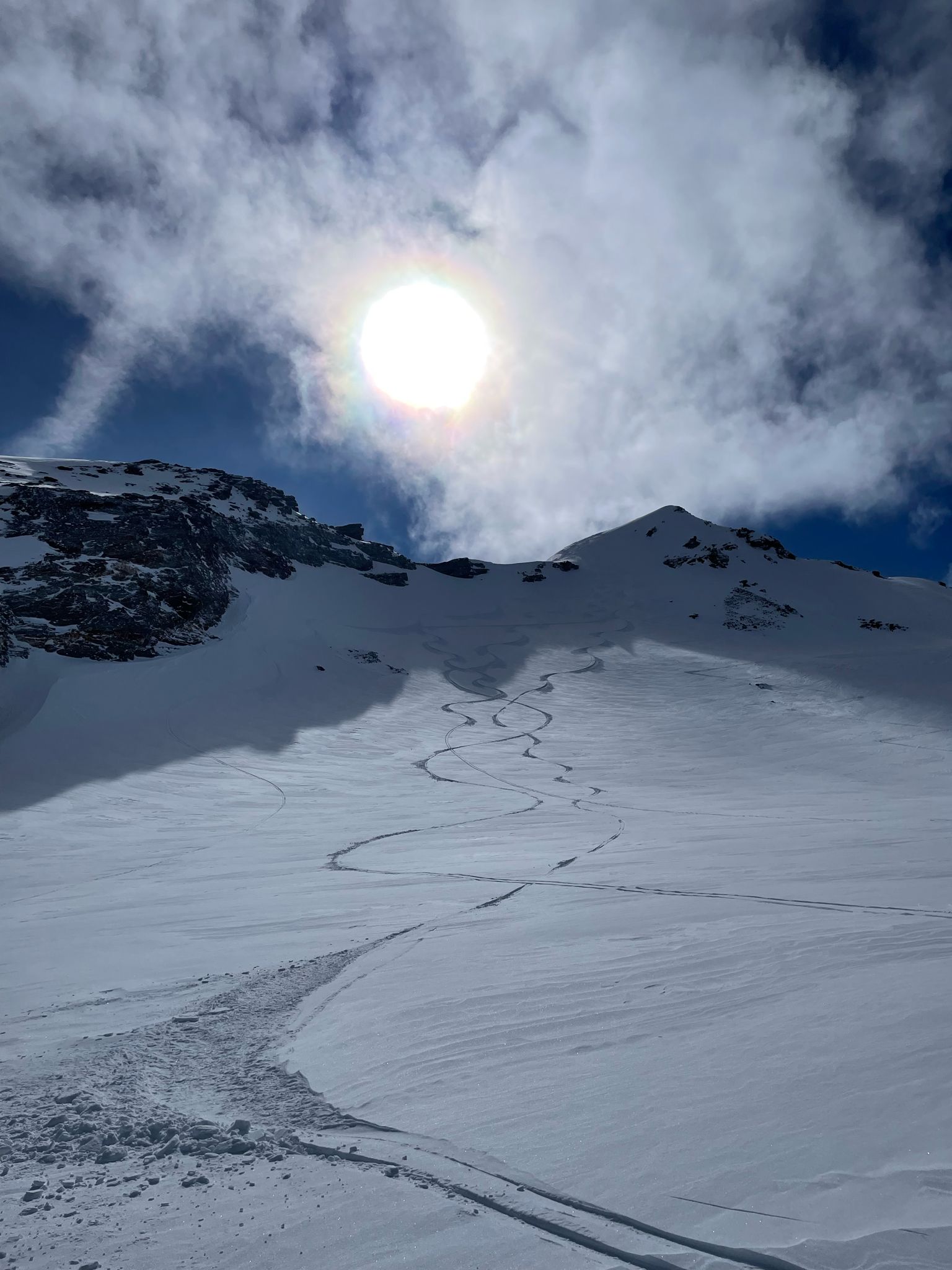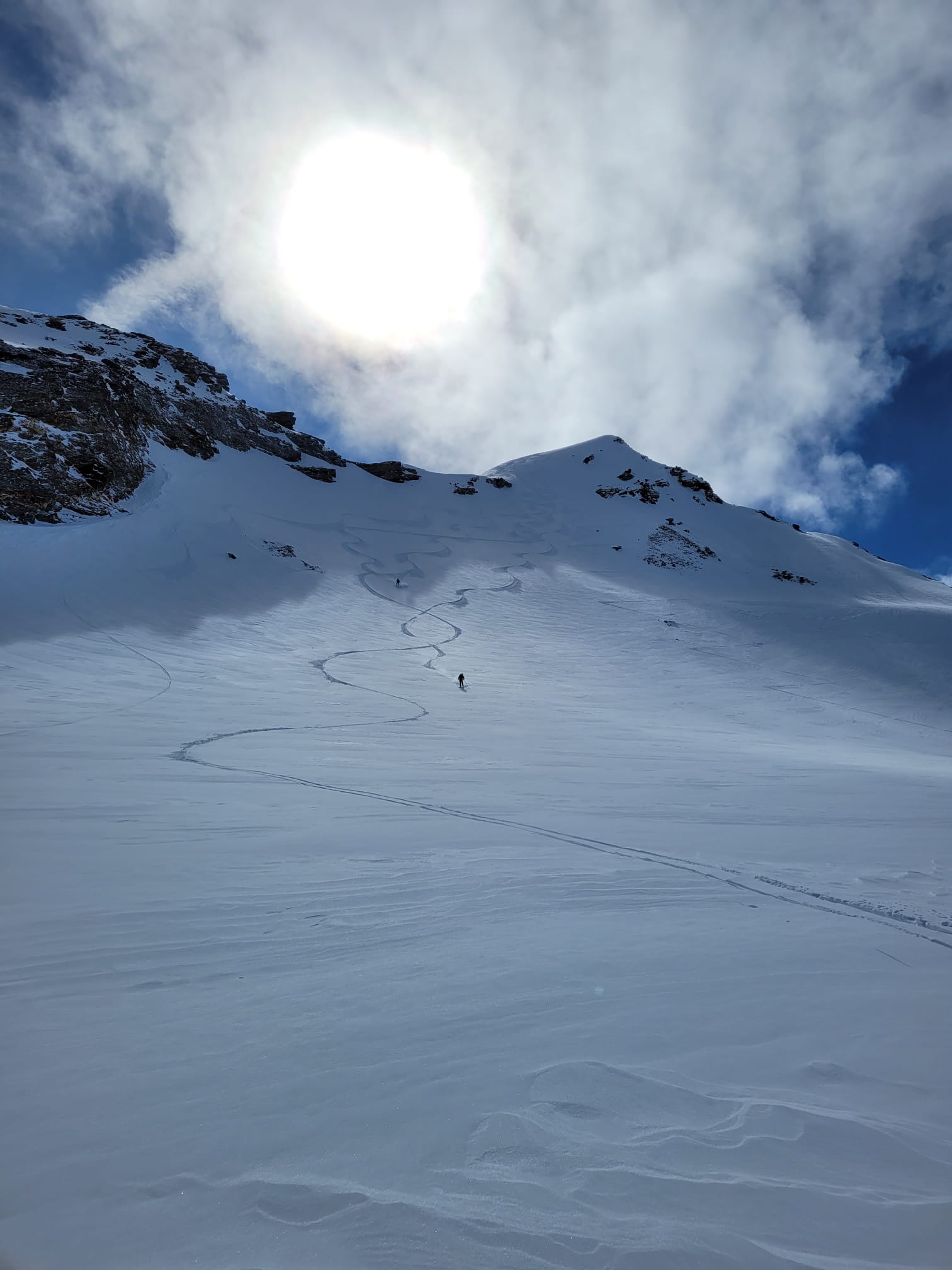 Seuls au monde sur cette classique, nous avons été un peu frustrés par quelques déposes d'héliski sur le glacier de Château Blanc (une quinzaine de traces de descente en plus des nôtres). Heureusement qu'il y a de l'espace et que la neige était bonne, nous avons pu quand même bien en profiter!