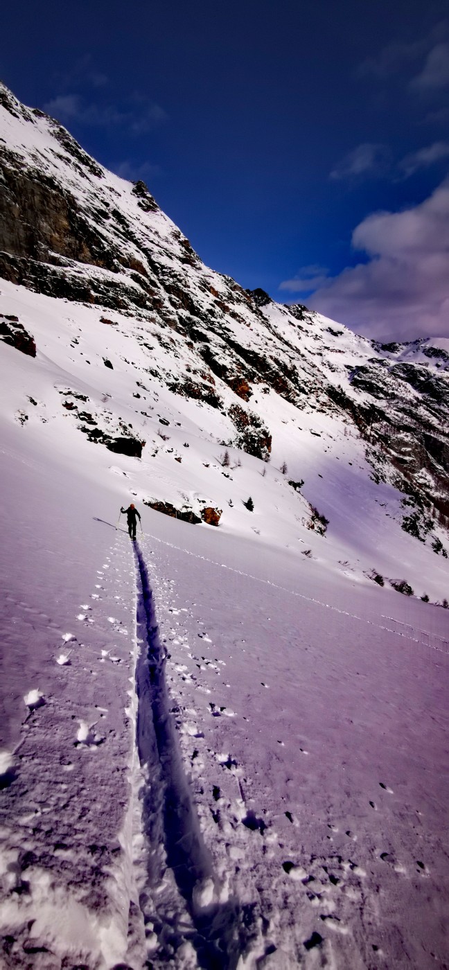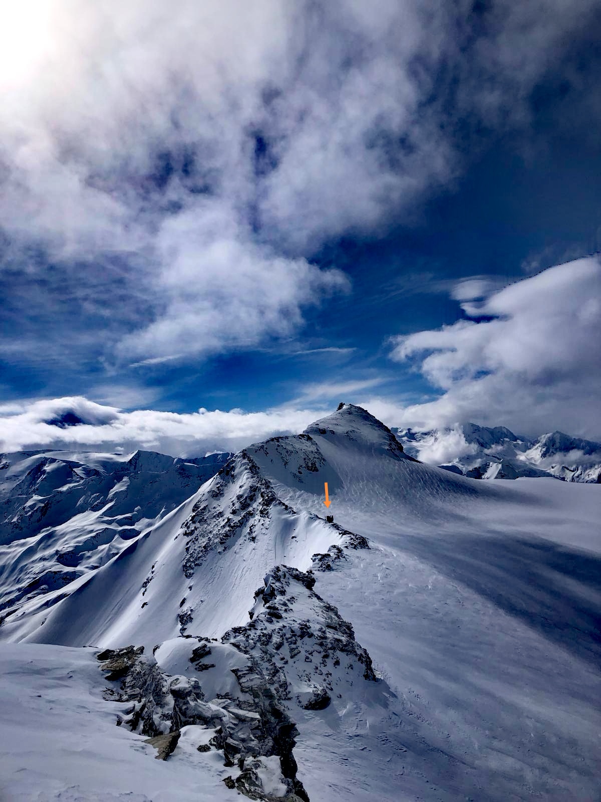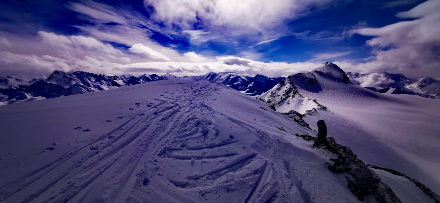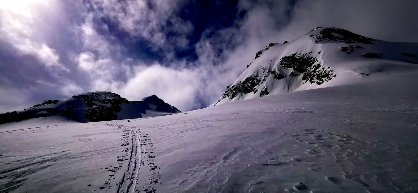 Seuls au monde sur cette classique, nous avons été un peu frustrés par quelques déposes d'héliski sur le glacier de Château Blanc (une quinzaine de traces de descente en plus des nôtres). Heureusement qu'il y a de l'espace et que la neige était bonne, nous avons pu quand même bien en profiter!